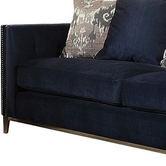 95" Blue Velvet And Black Sofa With Five Toss Pillows