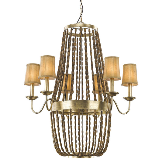 Anastasia 12-Light Antique Gold Leaf Chandelier With Wooden Beaded Chains And Gold Fabric Shades