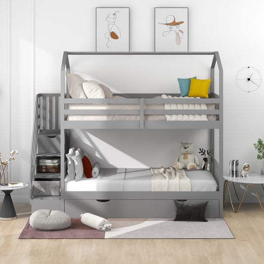 Gray Twin Over Twin Playhouse Bunk Bed with Trundle and Staircase
