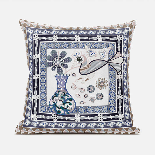 16" X 16" Beige and Blue Broadcloth Paisley Zippered Pillow