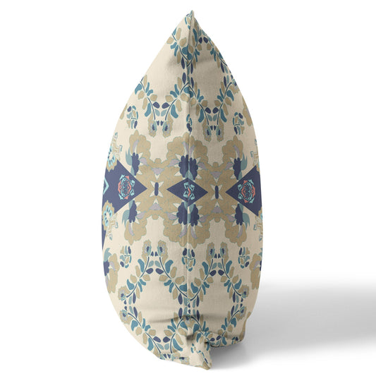 16" X 16" Cream And Blue Floral Blown Seam Suede Throw Pillow