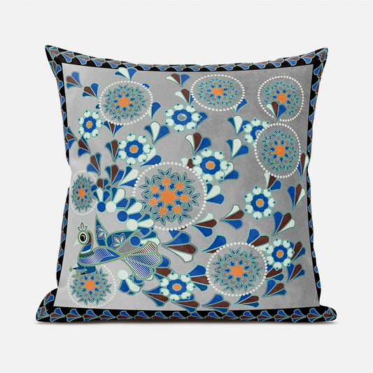 16" X 16" Gray And Blue Floral Zippered Suede Throw Pillow
