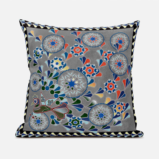 16" X 16" Gray and Orange Peacock Broadcloth Floral Zippered Pillow
