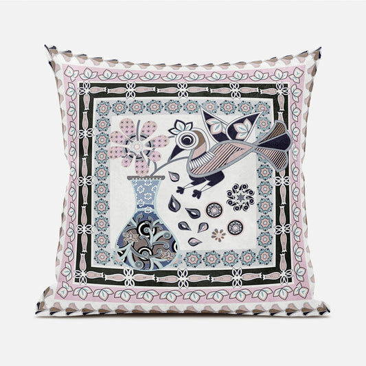 16" X 16" Pink And White Floral Blown Seam Suede Throw Pillow