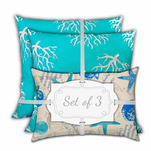 Set Of Three 18" X 18" Ocean Blue And White Corals Blown Seam Coastal Throw Indoor Outdoor Pillow