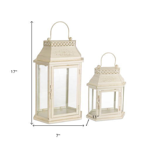 Set Of Two Beige Flameless Floor Lantern Candle Holder