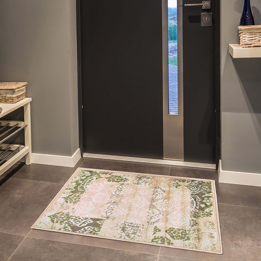 2' X 3' Beige Damask Power Loom Distressed Stain Resistant Area Rug