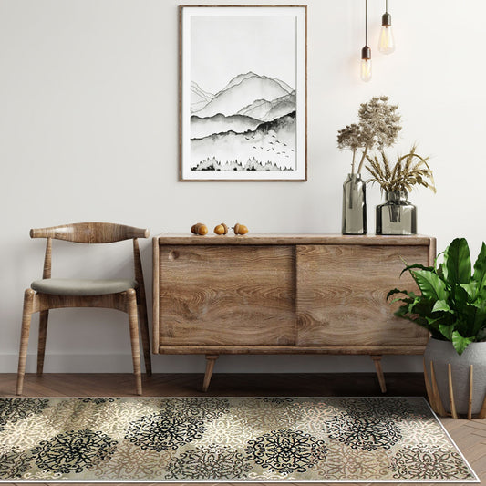 5' X 8' Tan Gray And Black Floral Medallion Stain Resistant Area Rug