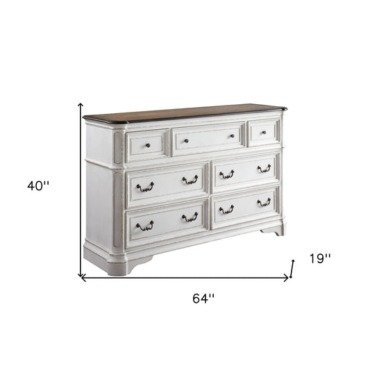 64" Brown and White Solid and Manufactured Wood Seven Drawer Triple Dresser