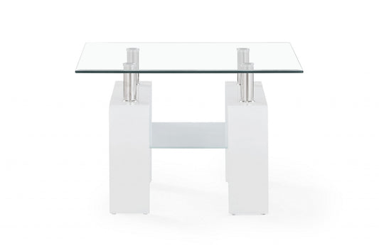 White Glossy Leg End Table With Rectangular Clear Glass Top