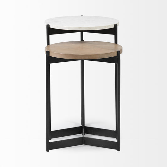 Set Of 2 Medium Brown Wood Round Top Side Tables With Marble Nesting