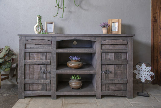 60" Gray Solid Wood Cabinet Enclosed Storage Distressed TV Stand