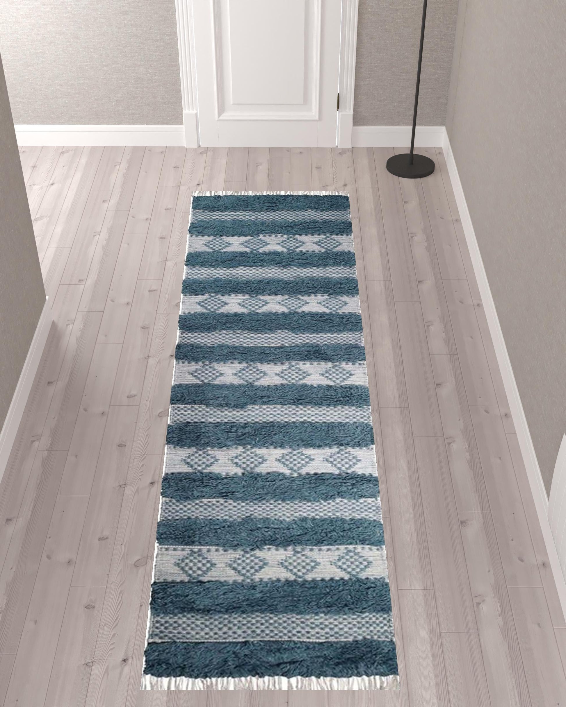 Add great coloration and comfortable texture to your space with this 10' blue and ivory wool striped flatweave handmade stain resistant runner rug with fringe. This runner shaped rug features a striped design in blue and ivory to give it visual interest. A classic shape marries with good looking design for your space Made in Turkey, this rug offers high quality combined with good looking designer sensibilities. Ideal for spaces with kids and pets, this rug is stain resistant to help repel stains and spilled liquids. Tassel ends bring a timeless and fashionable look to your interior. Area Rugs help to give warmth and sense of home to your space. 1.38" H x 31.2" W x 120" D