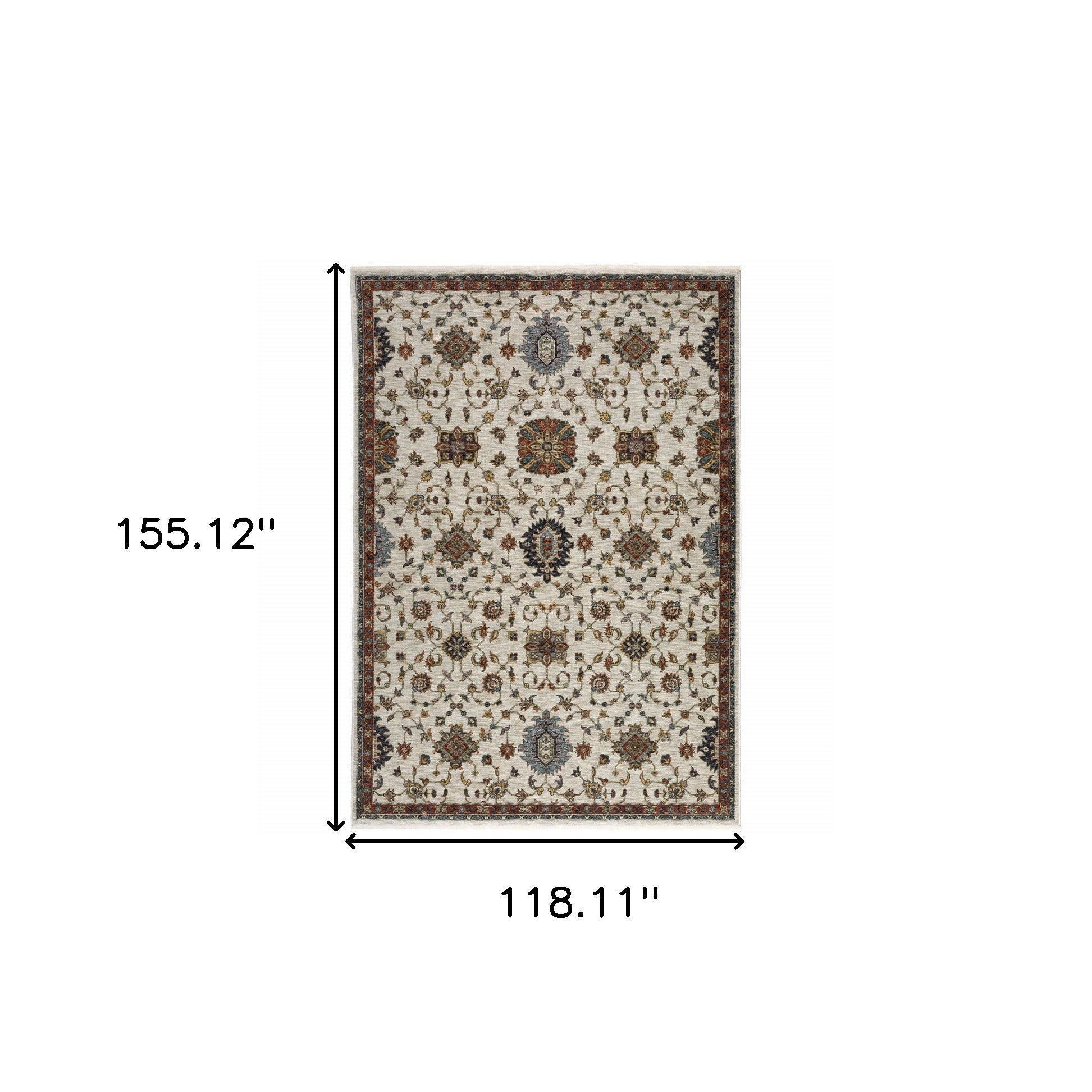 10' X 13' Beige Rust Red Blue Gold And Grey Oriental Power Loom Stain Resistant Area Rug With Fringe