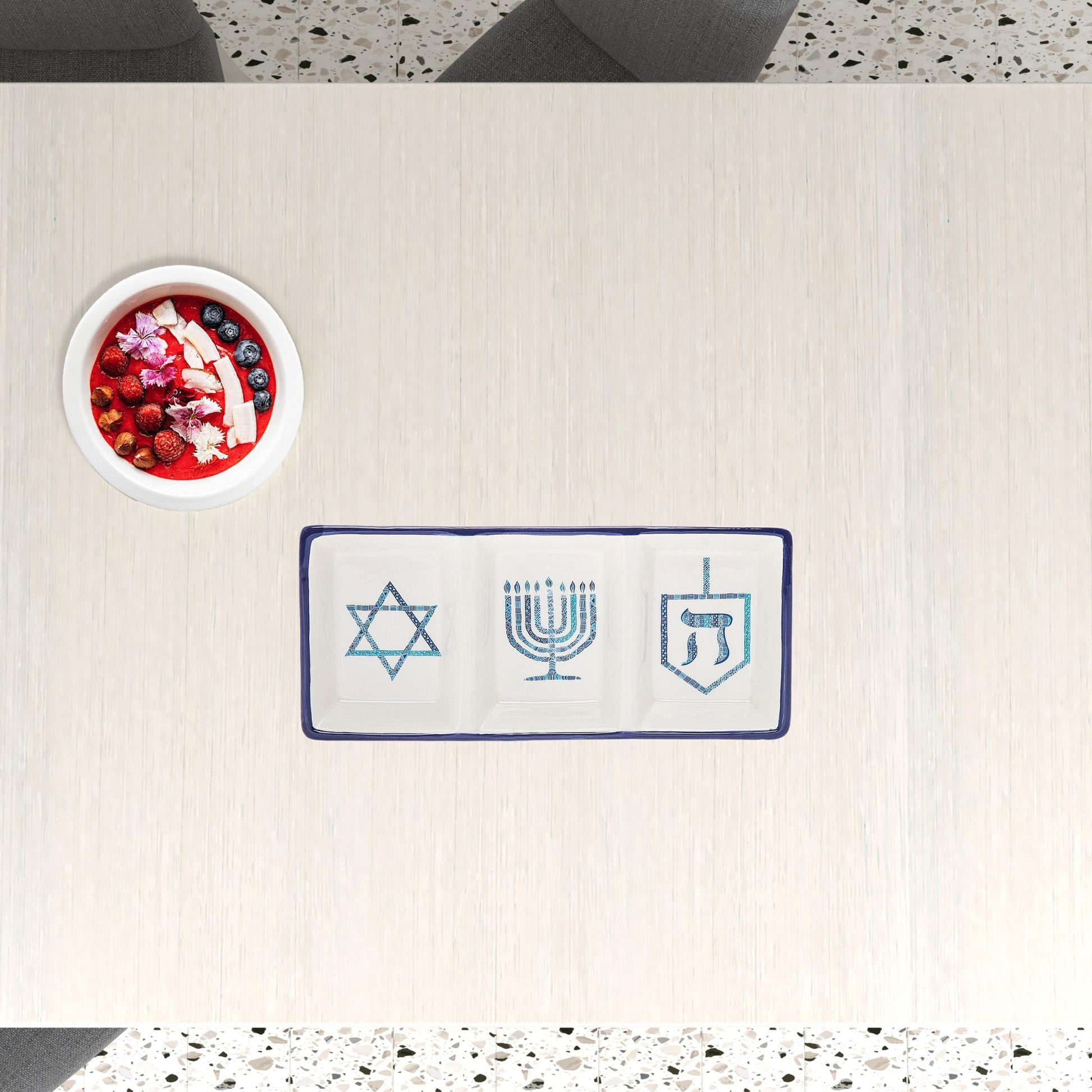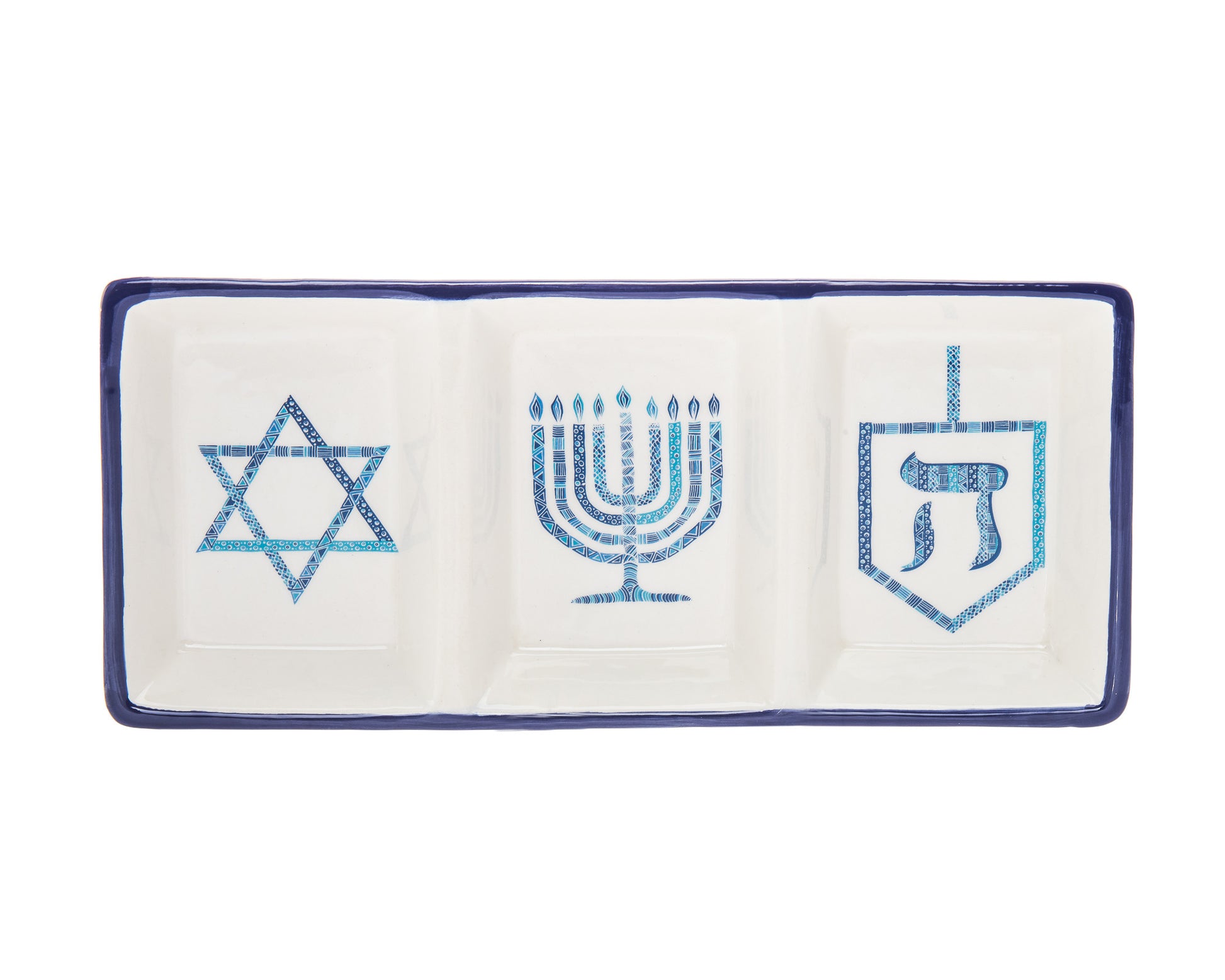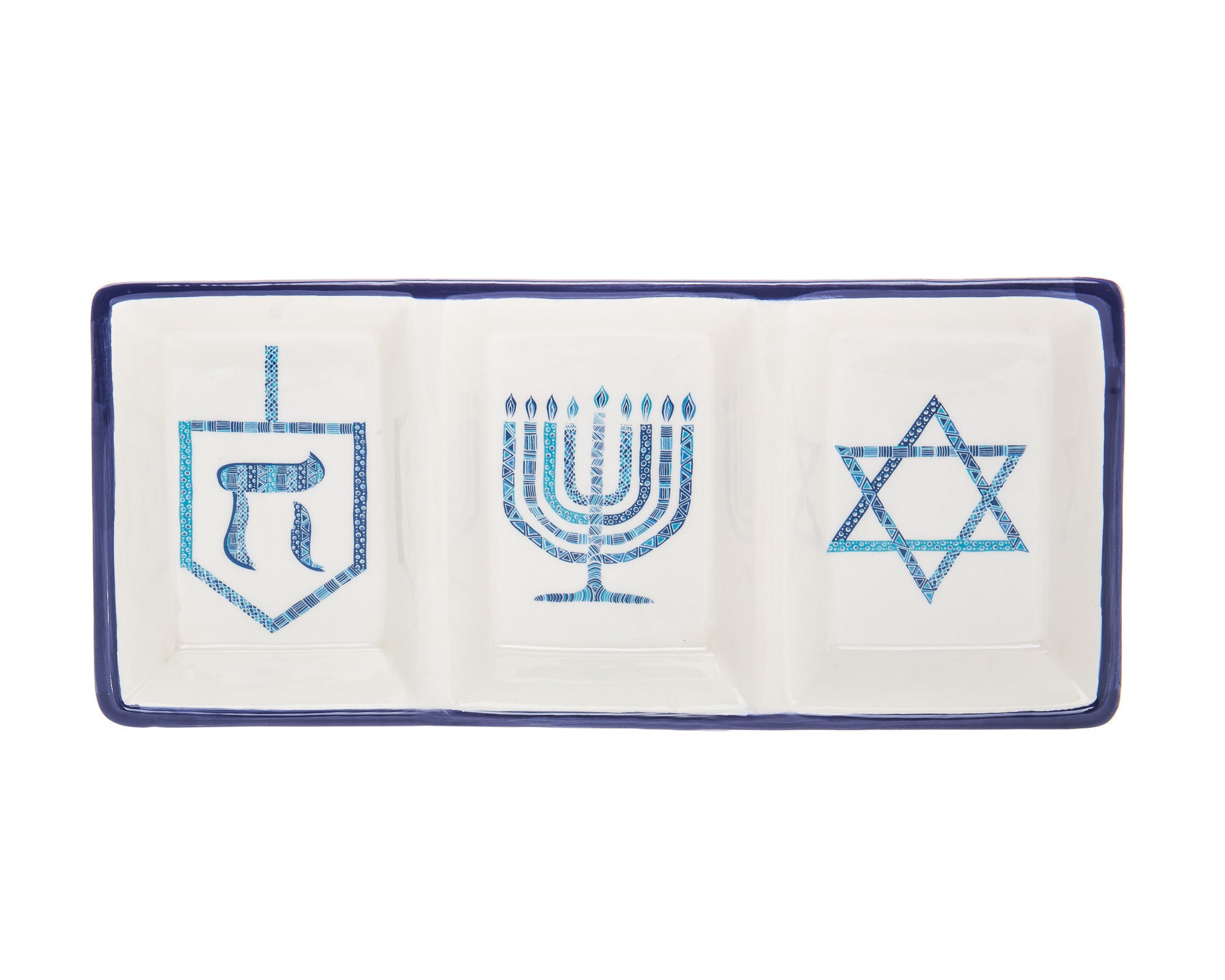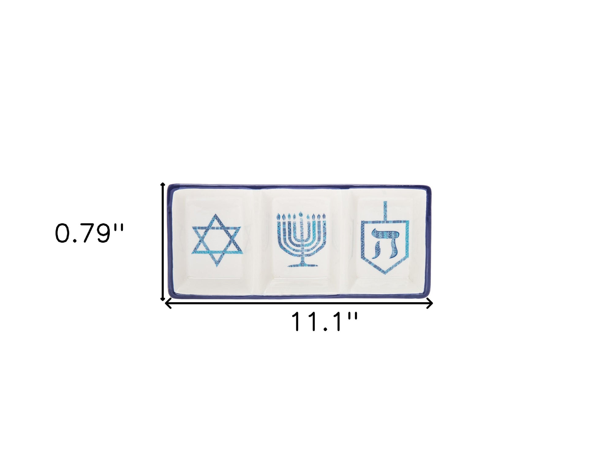 This 11" blue and white rectangular bone china Hanukkah serving tray will add a beautiful decorative accent to your decor. Keep the traditions and update the look with this superior quality bone china rectangular serving tray. Designed as a Hanukkah gift, for entertaining celebrations, or to use as a seasonal decoration. Food safe and versatile, this serving tray is sure to please. 0.79" H x 11.1" W x 4.96" D