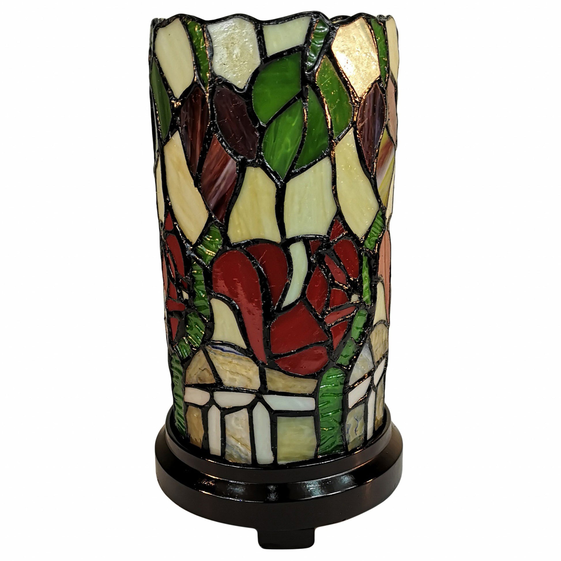 Add some warm light and beauty to your space at the same time with this 11" Tiffany Style Red Floral Accent Table Lamp. Hand-crafted with the same techniques used by the original Tiffany lamp makers, the glass for this cylindrical piece is hand cut and fused together to create a unique accent lamp that doubles as a colorful piece of artwork in itself. Each piece of glass is hand cut to the perfect shape and size, wrapped in copper foil, and soldered together to create a truly unique piece of art. The beautiful glass sits on a round resin base in black that makes this a great option for end table, desk, nightstand, or mantle. 14" x 8" x 8"