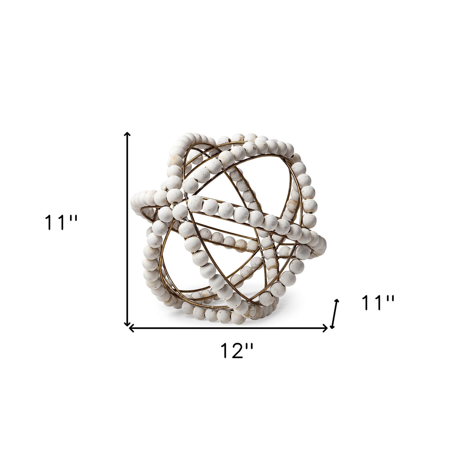 This White Wooden Bead and Gold Orb Sculpture is the perfect way to add some artistic design to the decor in your home. This decor piece is made from a rustic mixture of wood and metal. There is a spiral shaped metal frame which has a minimal line design and is colored in a matte dark rustic gold finish. There is a string of wooden beads that sit inside this metal frame all finished in a distressed white. This contemporary art-inspired piece has very muted colors and will look great in your home. You can use it in conjunction with other similar pieces or as a stand-alone unique decor piece.. 12" H x 11" W x 11" D