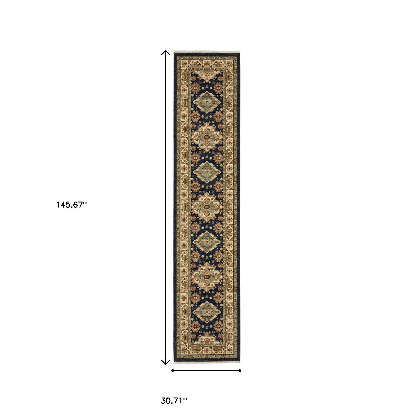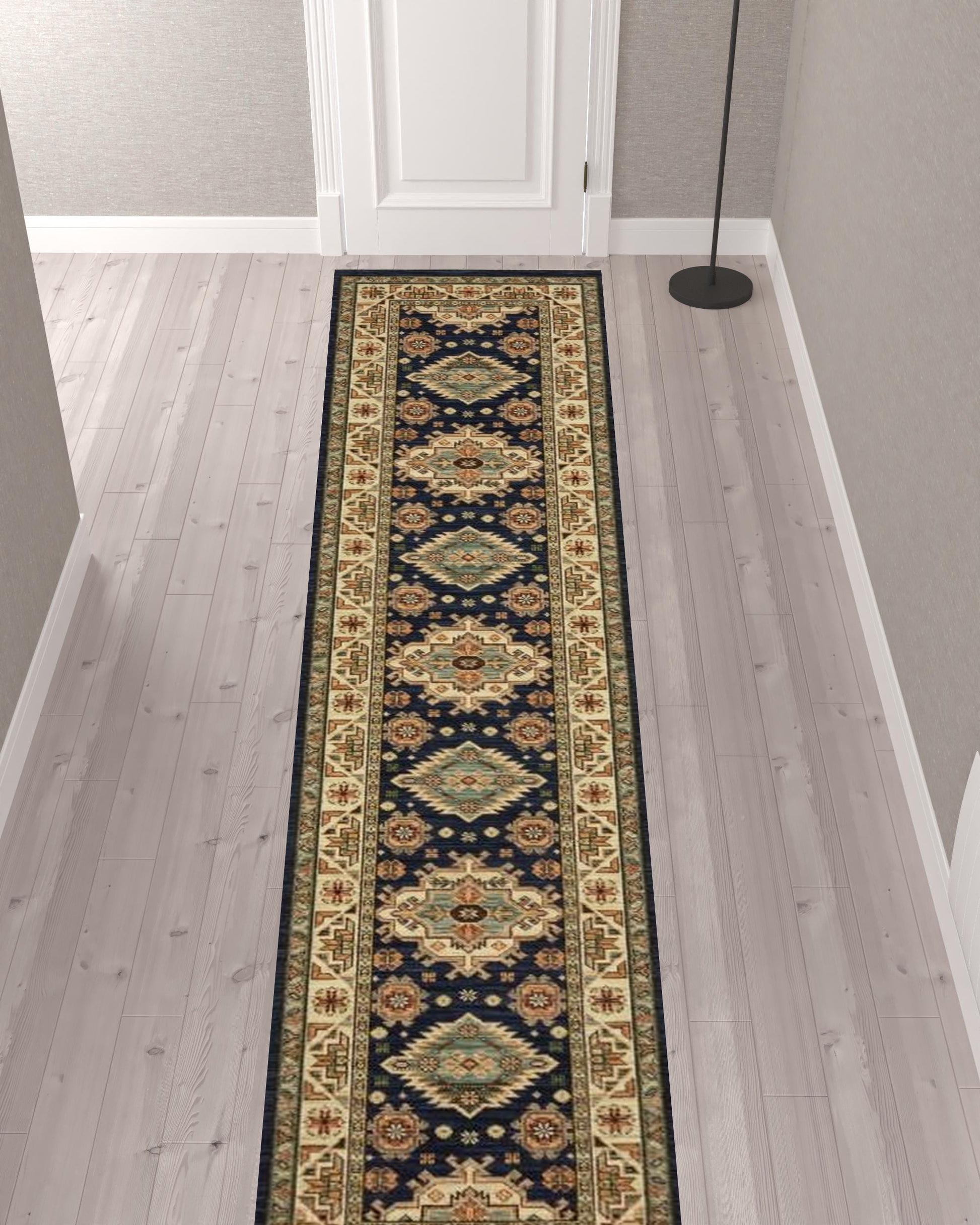 Add great coloration and comfortable texture to your space with this 12' navy charcoal orange rust gold pale blue olive beige and salmon oriental power loom runner rug with fringe. This runner shaped rug features a oriental design in navy charcoal orange rust gold pale blue olive beige and salmon to give it visual interest. A classic shape marries with good looking design for your space Ideal for spaces with kids and pets, this rug is stain resistant to help repel stains and spilled liquids. Tassel ends bring a timeless and fashionable look to your interior. Area Rugs help to give warmth and sense of home to your space. 0.31" H x 30.71" W x 145.67" D