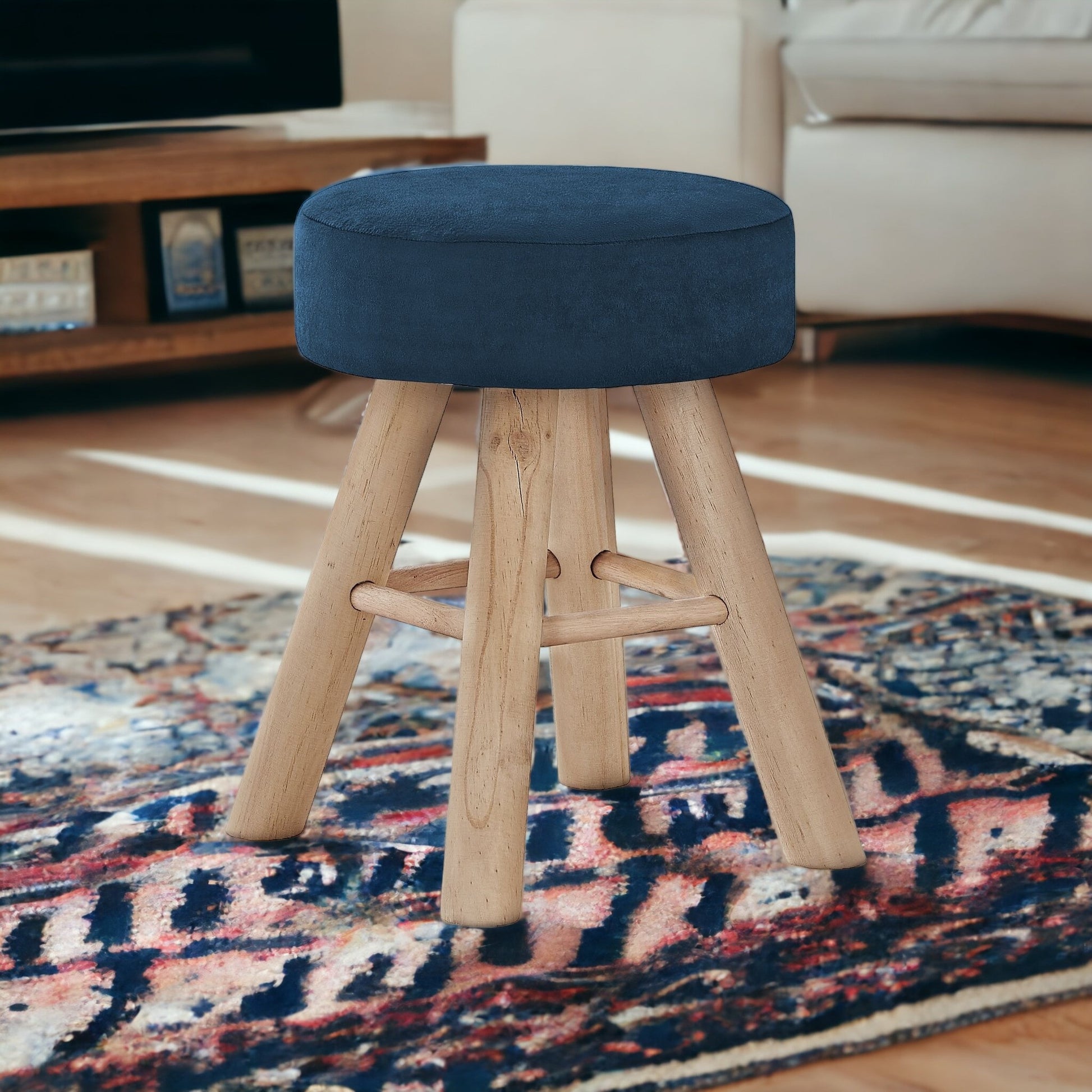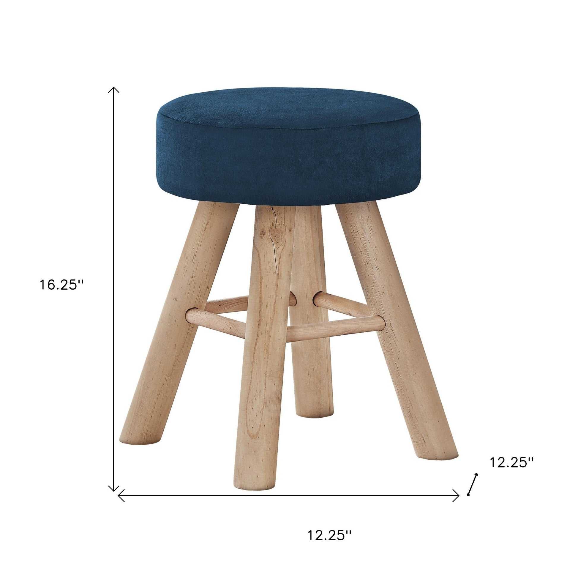 Get ready to relax with this 12" blue velvet and natural round ottoman. A natural solid wood frame is finished off with a blue upholstery seat that is the epitomy of quality construction and design. Expertly upholstered with padding in a soft solid color velvet, this ottoman is as comfortable as it is good looking. Easy to blend into most any room, a ottoman is a way to add a good looking accent to your space that can also be practical and useful. . 16.25" H x 12.25" W x 12.25" D