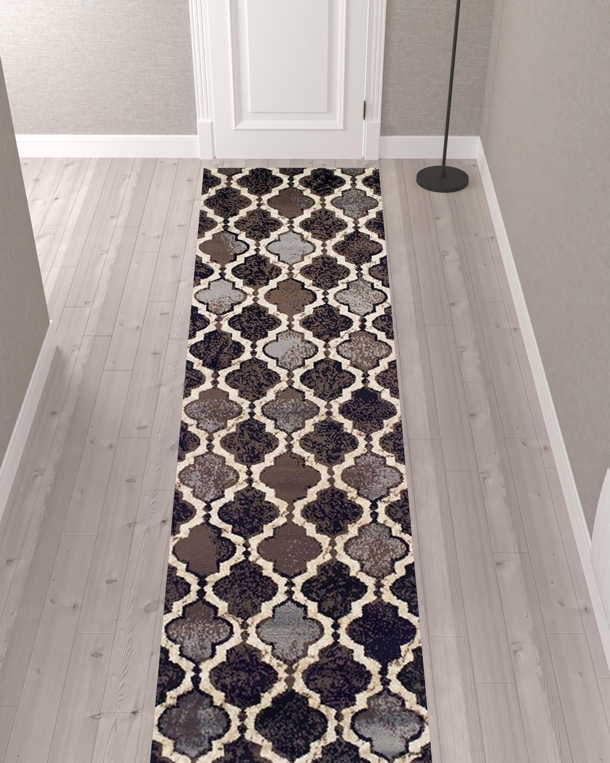 12' Chocolate Quatrefoil Power Loom Distressed Stain Resistant Runner Rug