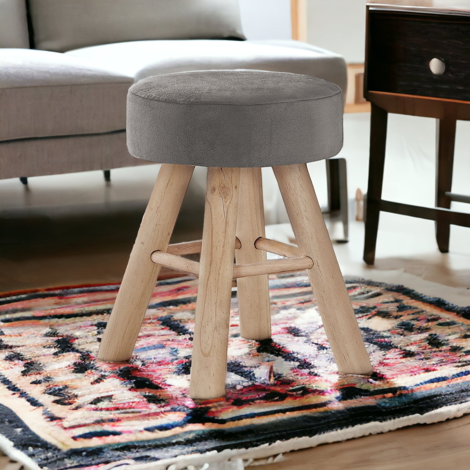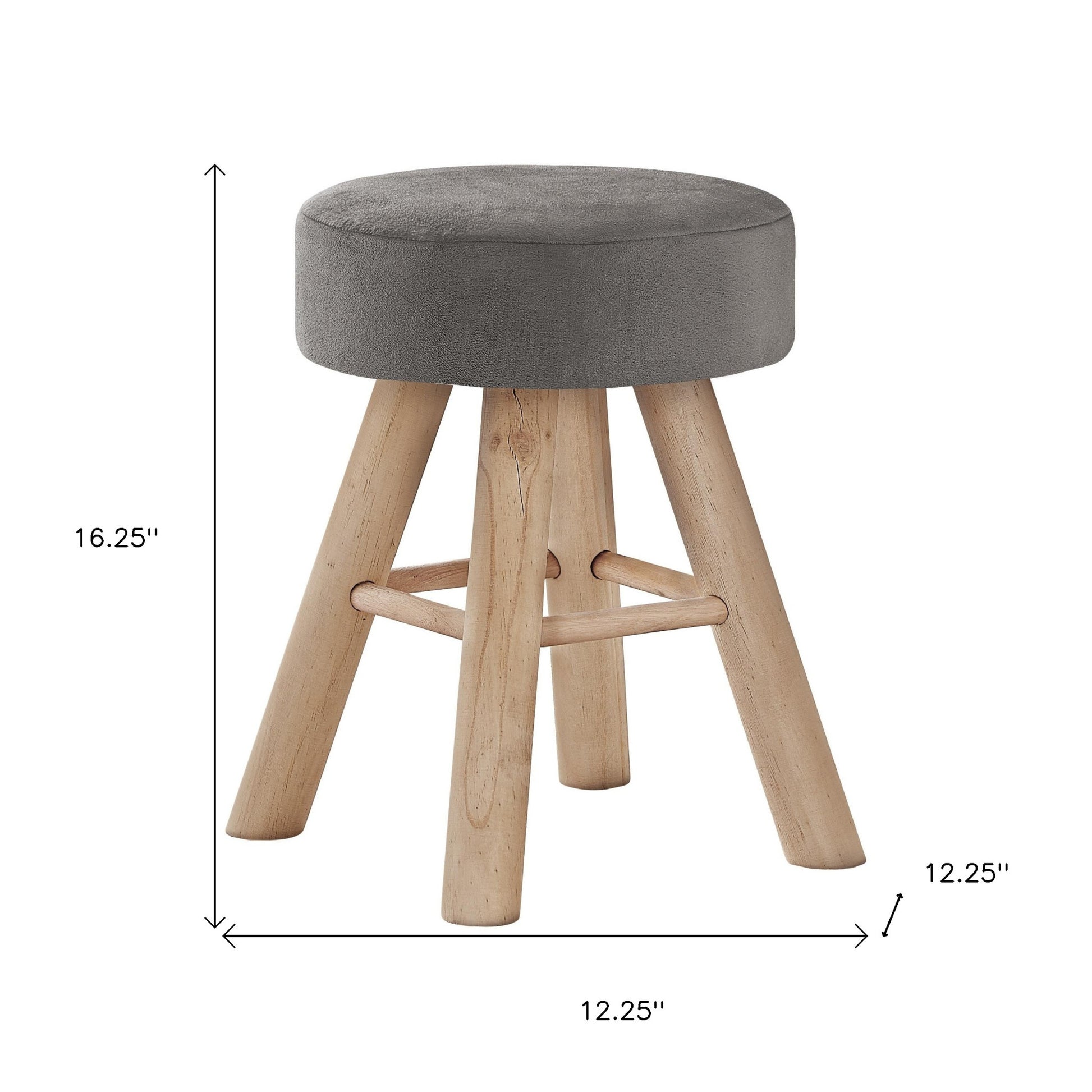 Practicality and fashion mix together with this handy 12" gray velvet and natural round ottoman. The gray upholstery top of this ottoman is a nice contrast to the high quality, natural solid wood of the base. Expertly upholstered with padding in a soft solid color velvet, this ottoman is as comfortable as it is good looking. Ottomans are multi-functional additions to your space that add fashion and practical value. 16.25" H x 12.25" W x 12.25" D