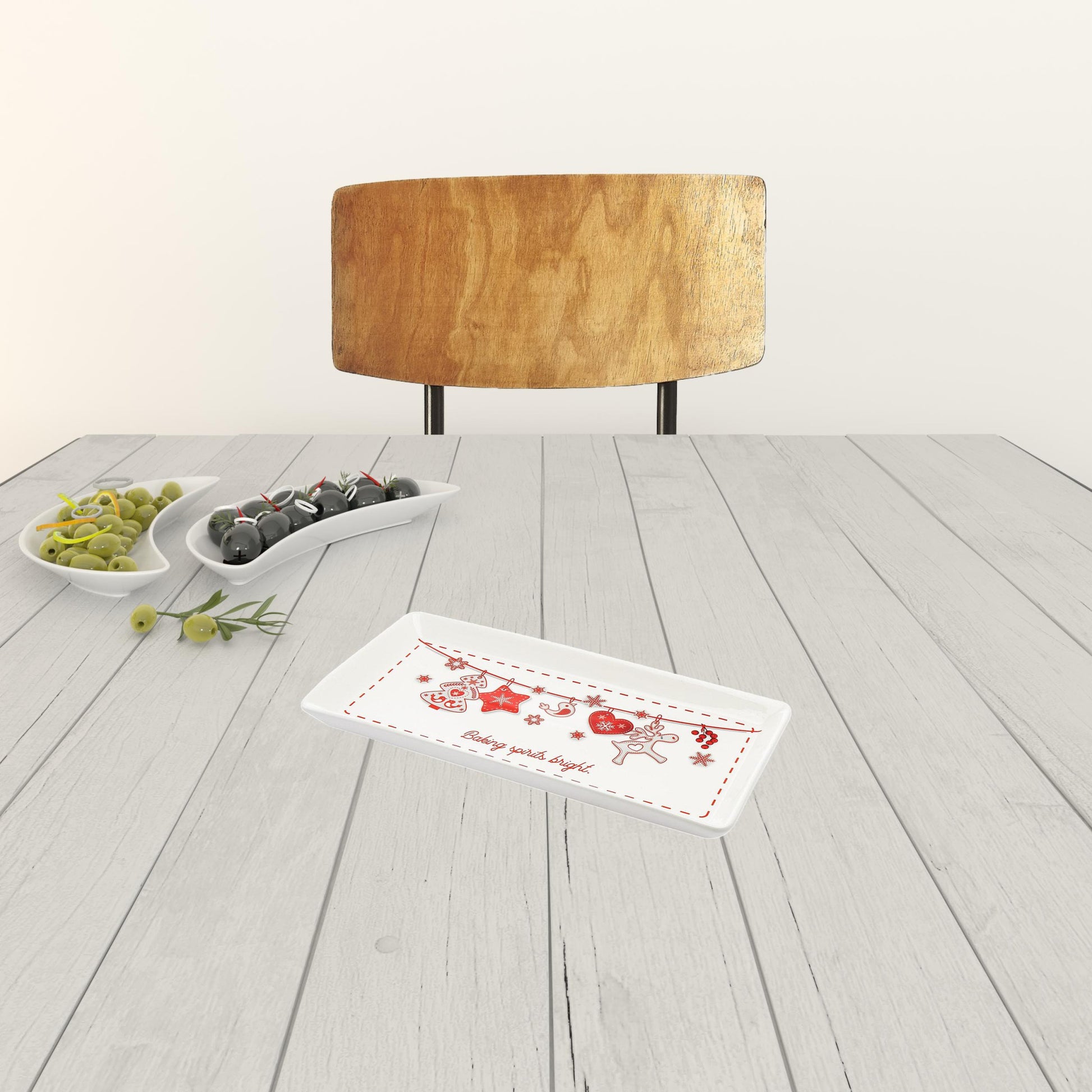 Freshen up your space with this convenient and good looking 12" red and white rectangular porcelain china christmas serving tray! Since it's made from high quality porcelain china you'll get years out of this elegant and durable rectangular serving tray. Designed as a christmas gift, for entertaining celebrations, or to use as a seasonal decoration. This serving tray has a food safe finish. 0.91" H x 11.89" W x 5.83" D