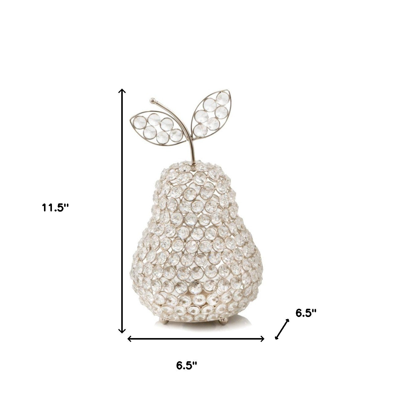 Sparkle and shine all day long with this 11.5" Silver Pear Faux Crystal Sculpture. An elegant and exciting statement piece this gorgeous medium size pear will light up the room. The shimmering faux crystals and silver base make this a sparkling and special accessory for your tabletop, dresser, hutch, or mantle. 11.5" x 6.5" x 6.5"