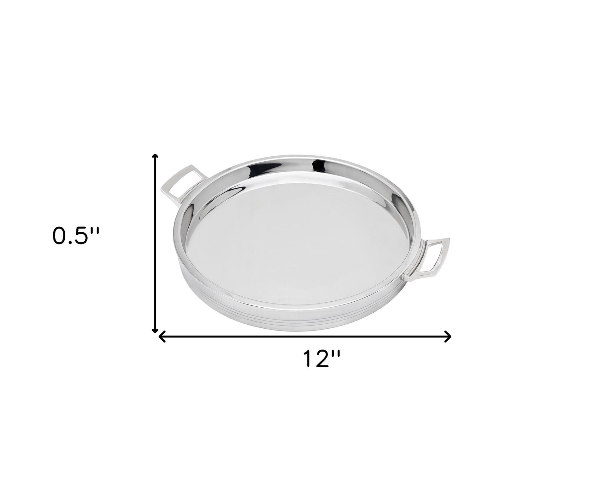 This gorgeous round tray is crafted of stainless steel. Crafted of high quality stainless, this gorgeous tray with fine line detailing around the edge will stand out as an entertaining and decorating star. Perfect for your bar cart, coffee table, counter or buffet, this clean and modern serving tray is a true gem. Features handles for quick and easy transportation. Food safe and versatile, this tray is sure to please. 0.5" H x 12" W x 12" D
