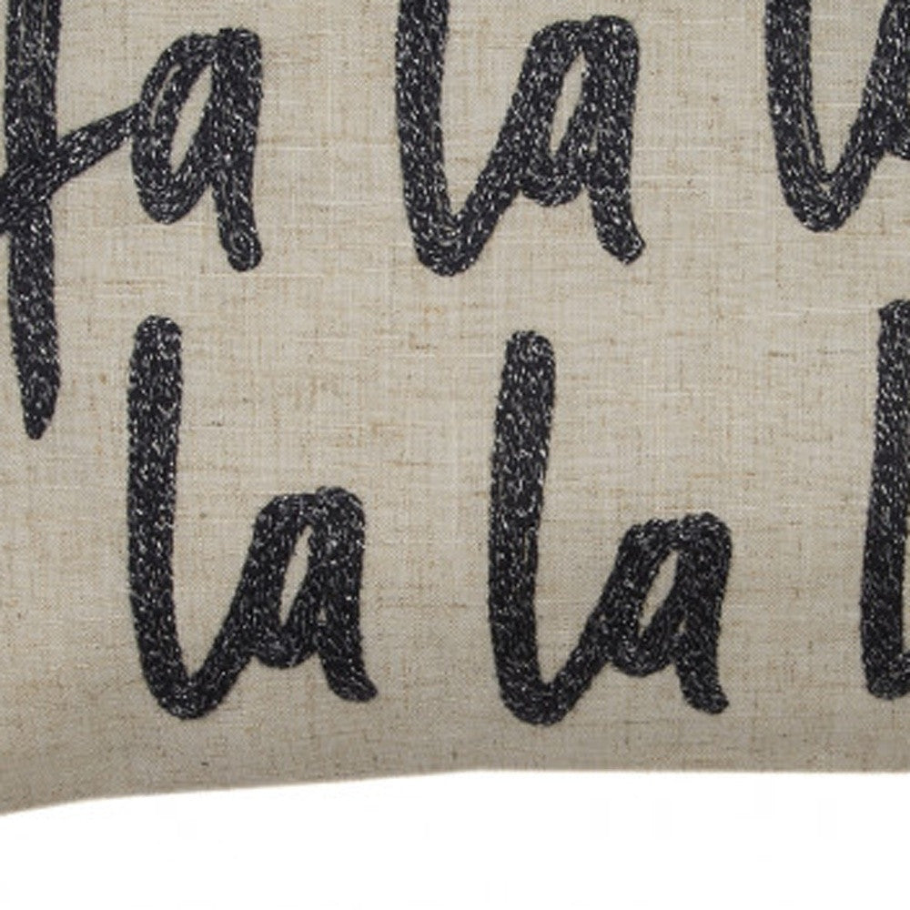 Add some Christmas cheer to your space with this 12-inch x 20-inch beige and black christmas linen linen blend zippered pillow with embroidery. This soft and durable decorative pillow is expertly made of high grade, long lasting linen blend in a beige and black coloration. Super soft and built to hold its shape, this polyfill pillow is a great option. Emblazoned with the text fa la la la la la la la this pillow adds some visual interest and decor to your space. For anyone that loves to decorate or accent their space with color and texture. Decorative pillows are a great way to change up the look and feel of your space easily and quickly. 12-inch H x 20-inch W x 4-inch D