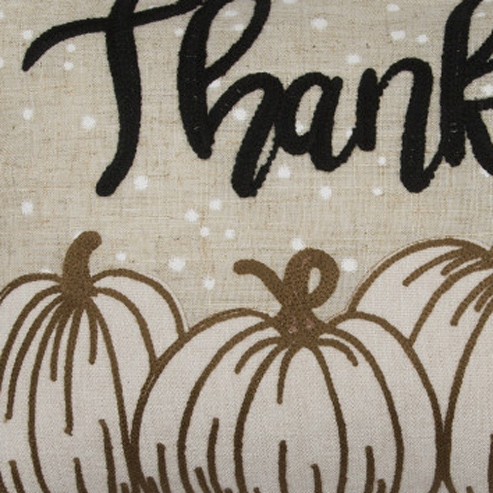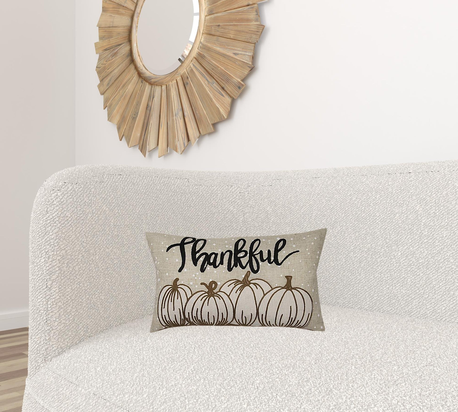 Set a festive fall mood with this cozy and fun 12-inch x 20-inch beige and white thanksgiving pumpkin linen blend zippered pillow with applique. Durable beige and white linen blend has been used to give this pillow a beautiful look that will stand the test of time. Fun and decorative applique add some high end and hand-crafted textural designer touches. Super soft and built to hold its shape, this polyfill pillow is a great option. Emblazoned with the text thankful this pillow adds some visual interest and decor to your space. Decorative throw pillows not only add color and dimension to your space but can be comfy and supportive when you are lounging and cuddling as well. A great decorative accessory for your favorite chair, to accent your sofa, or to use as part of your bed ensemble. 12-inch H x 20-inch W x 4-inch D