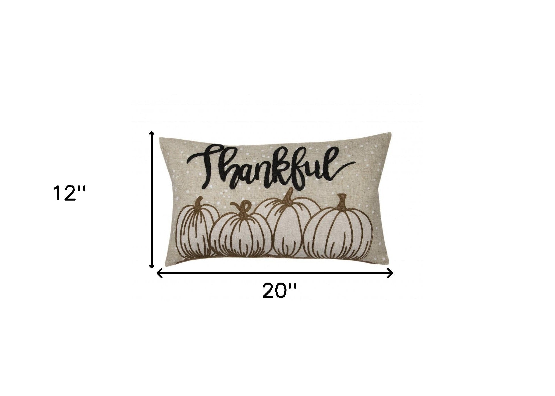 12" X 20" Beige and White Thanksgiving Pumpkin Linen Blend Zippered Pillow With Applique