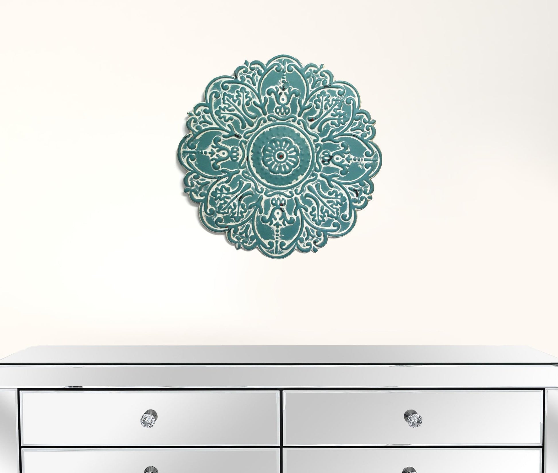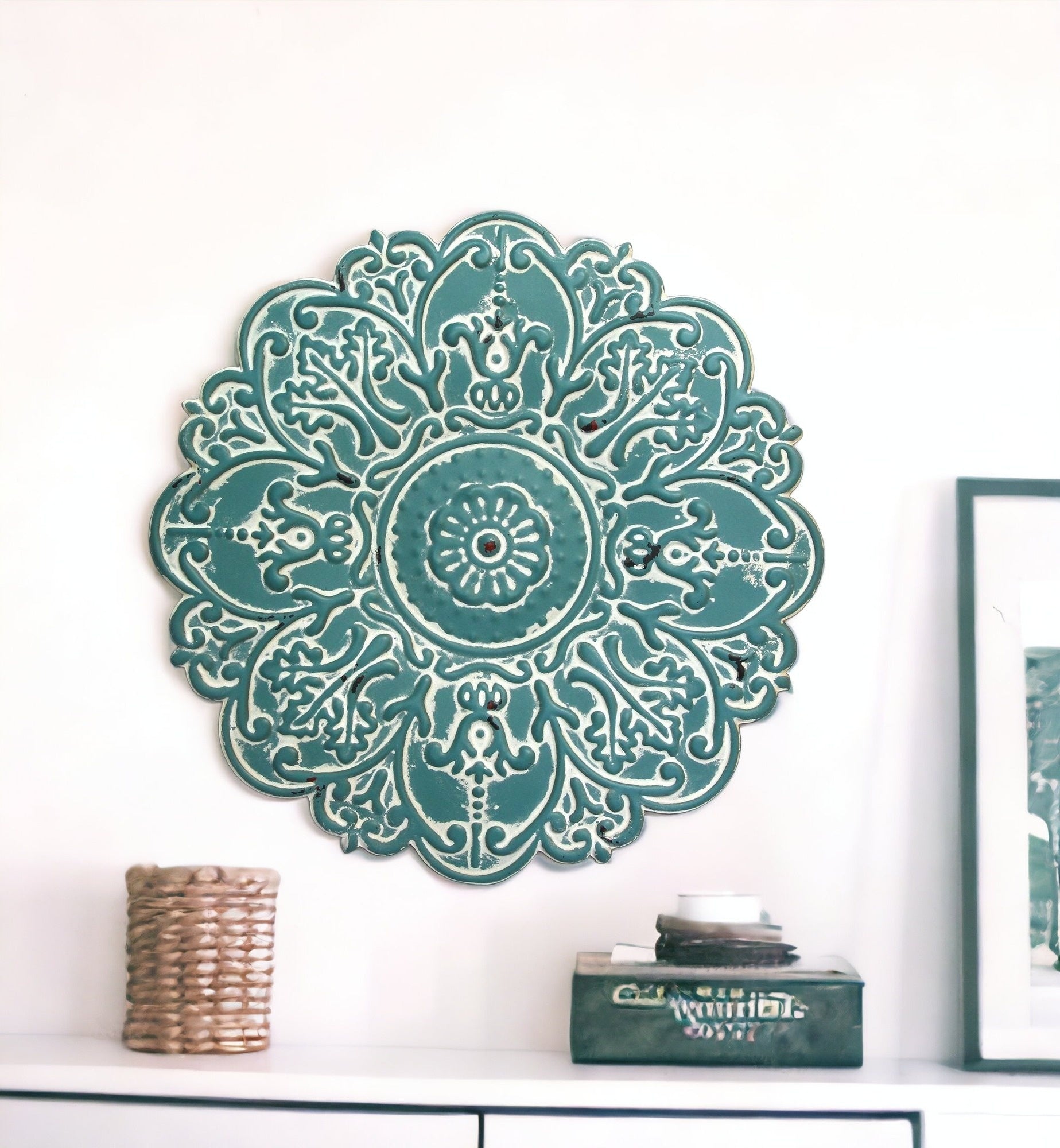 Add an air of fashion to your room and rejuvenate the space with this 13" Teal Blue medallion distressed metal wall decor. This round decorative wall art features a distressed finish that gives it a rustic / vintage vibe. Hang on your wall to add some up to date fashion and decoration. Utilize this opportunity to create a focal point in the room with this fabulous wall decor option. 13-inch H x 13-inch W x 0.5-inch D