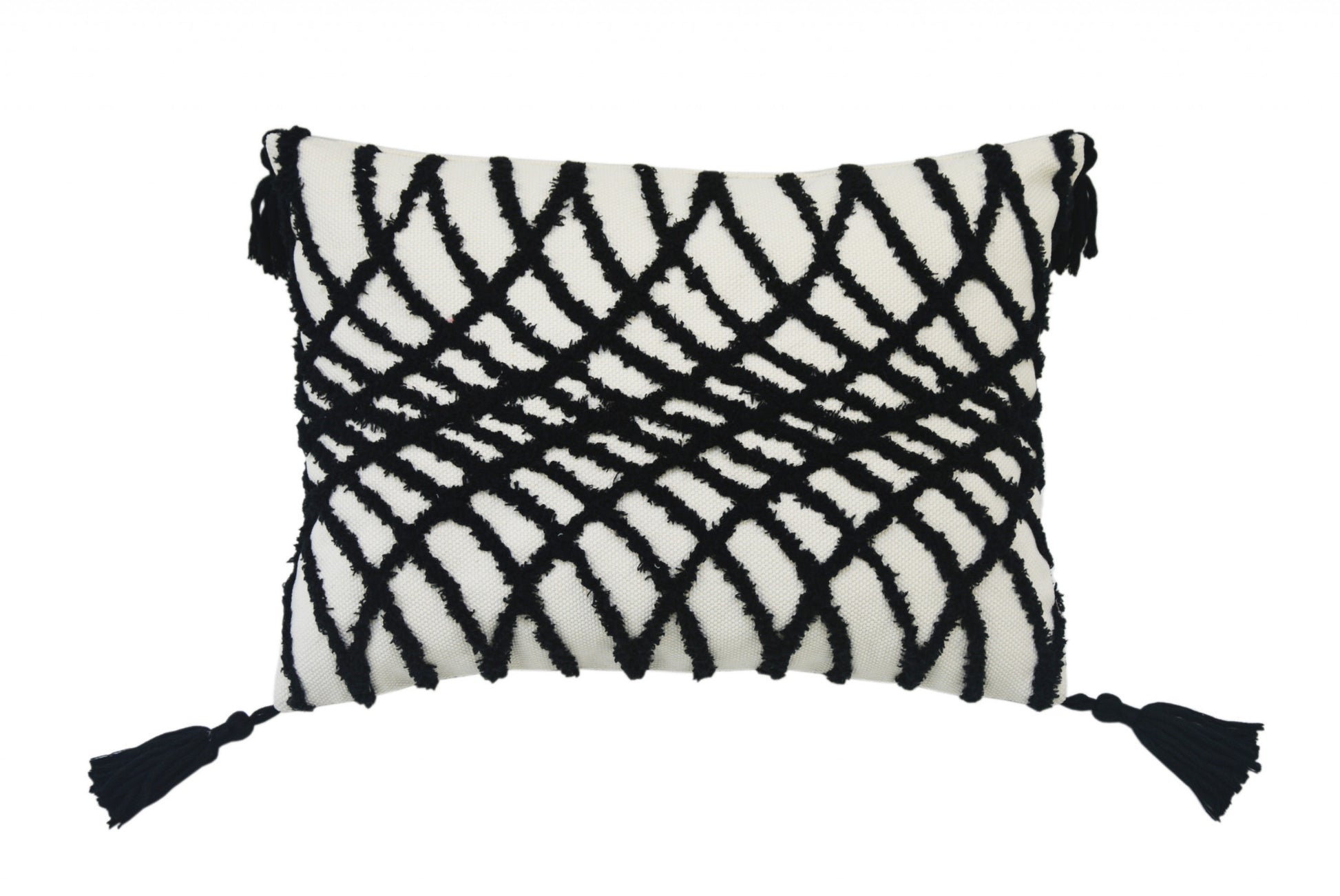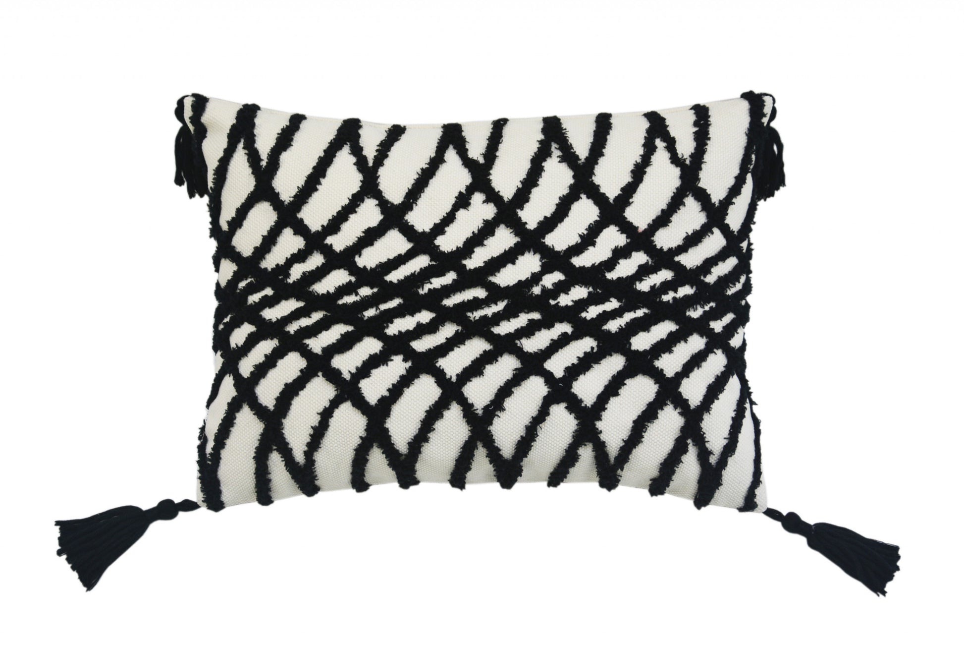 13" X 18" Black And White Geometric Zippered Polyester And Cotton Blend Throw Pillow With Tassels