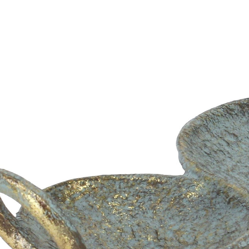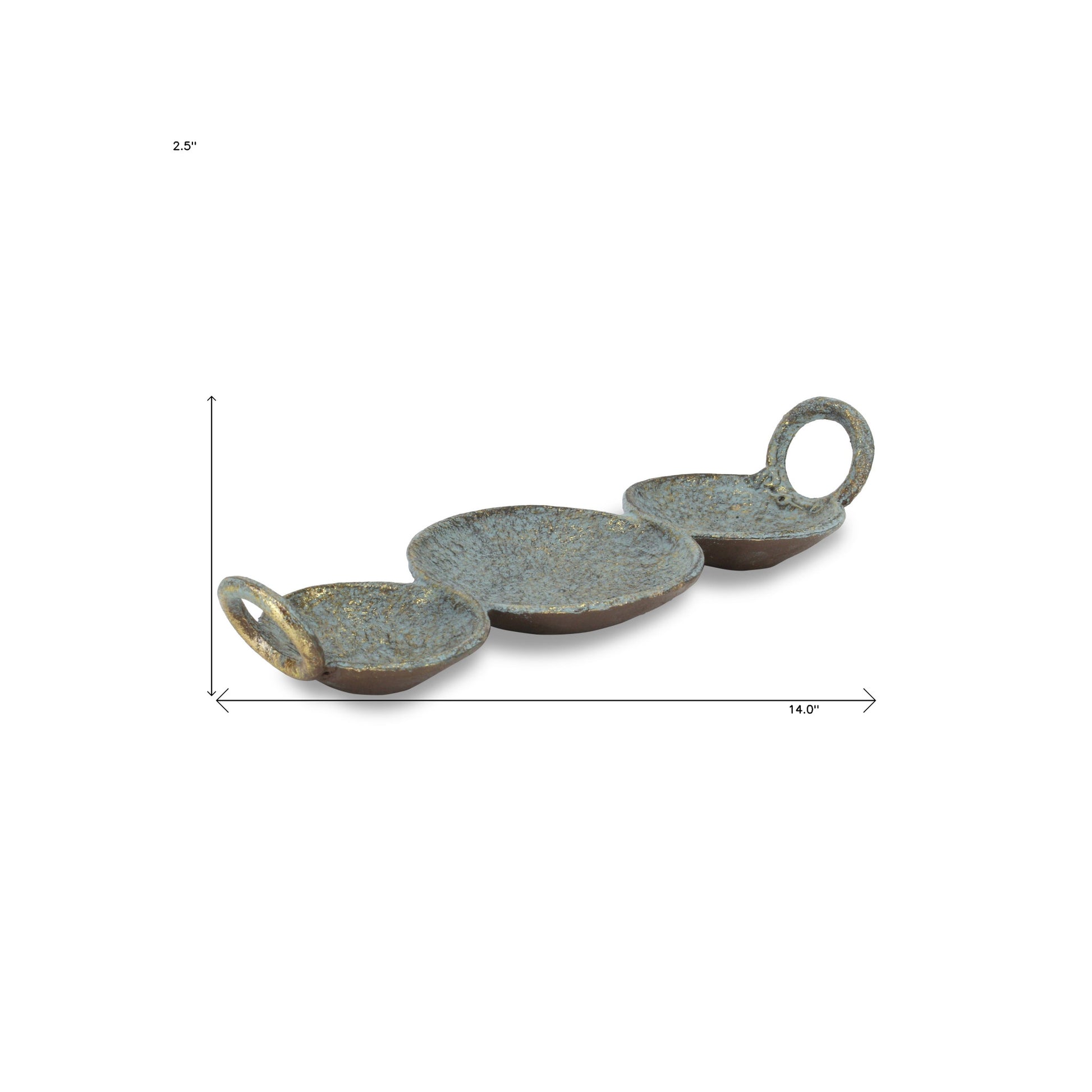 This 14" brushed blue green novelty metal handmade tray with handles will add a beautiful decorative accent to your decor. This gorgeous novelty tray is crafted of rustic hand painted gold and brushed rustic blue green metal. Designed with handles for easy transport and convenience. Intended for decorative, non-food use only, it's the perfect decorative accent piece. 2.5" H x 14" W x 4.75" D