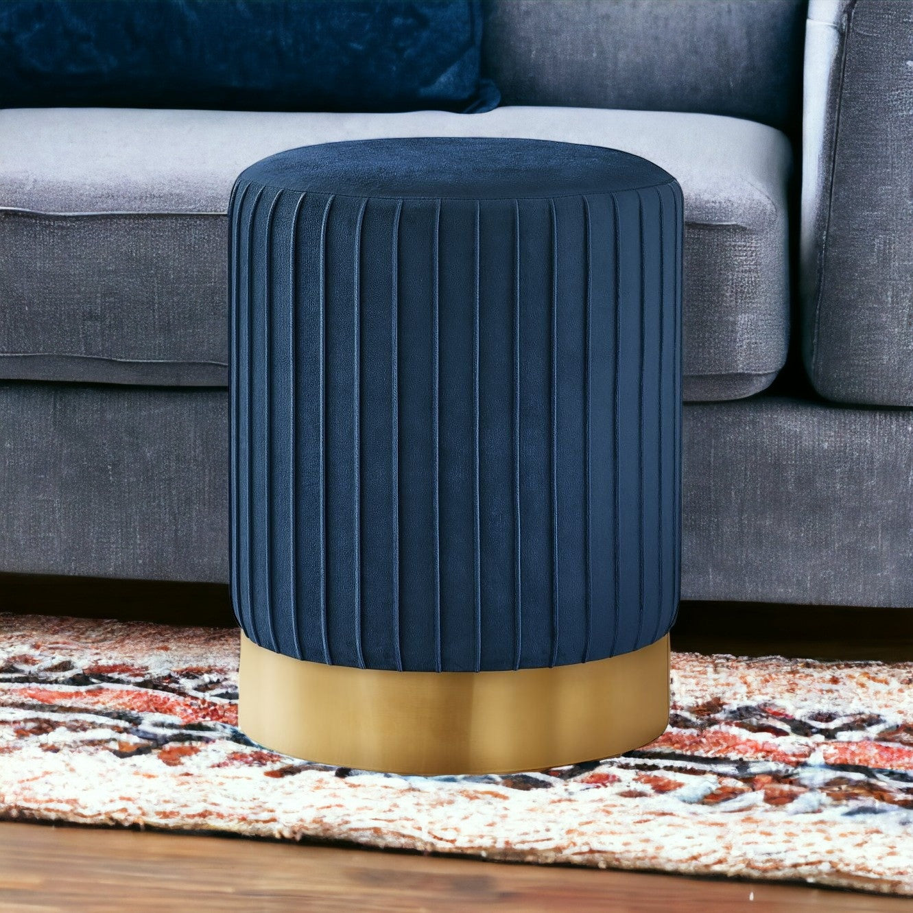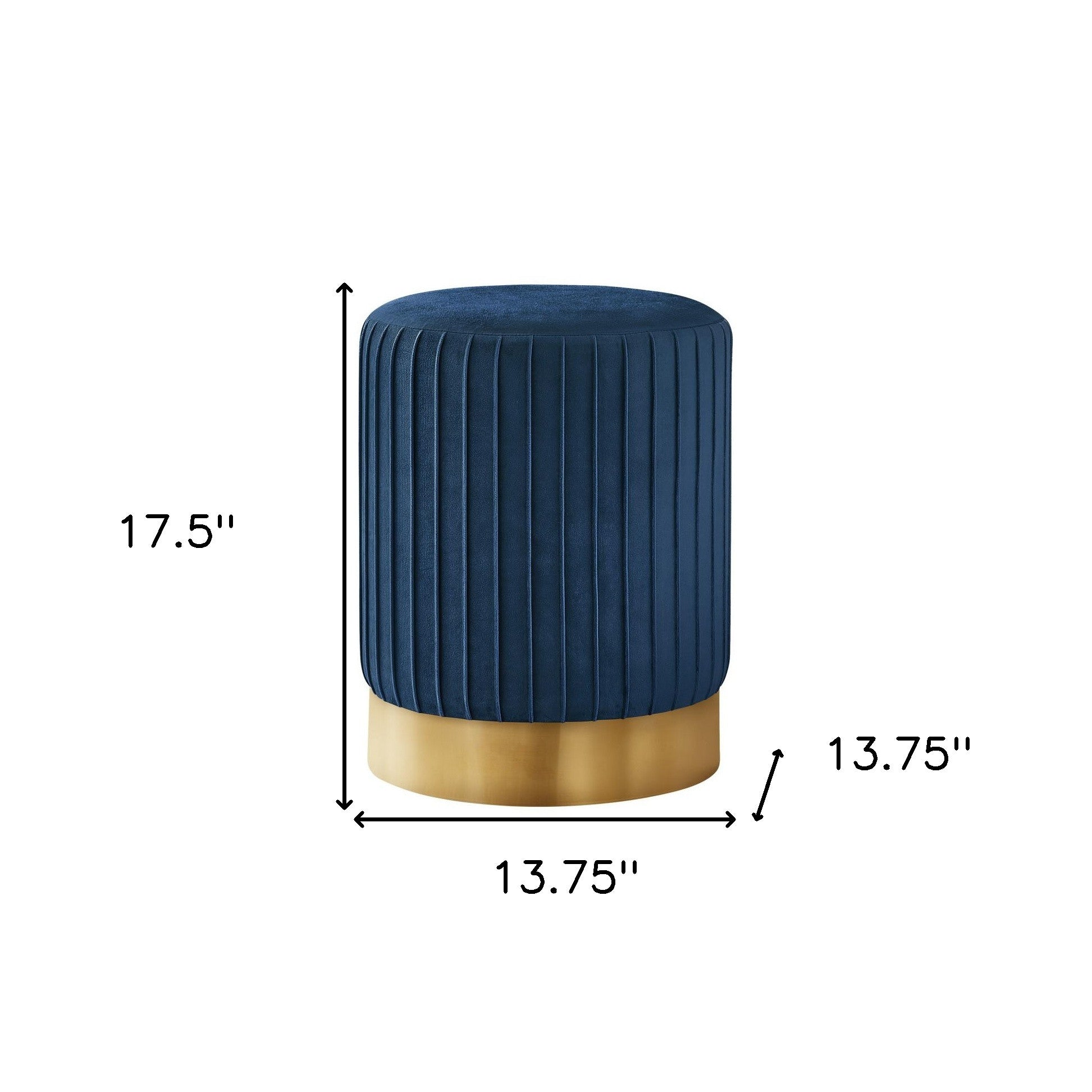 Practicality and fashion mix together with this handy 14" blue velvet and gold round ottoman. The blue upholstery top of this ottoman is a nice contrast to the high quality, gold metal of the base. Expertly upholstered with padding in a soft solid color velvet, this ottoman is as comfortable as it is good looking. Easy to blend into most any room, a ottoman is a way to add a good looking accent to your space that can also be practical and useful. . 17.5" H x 13.75" W x 13.75" D