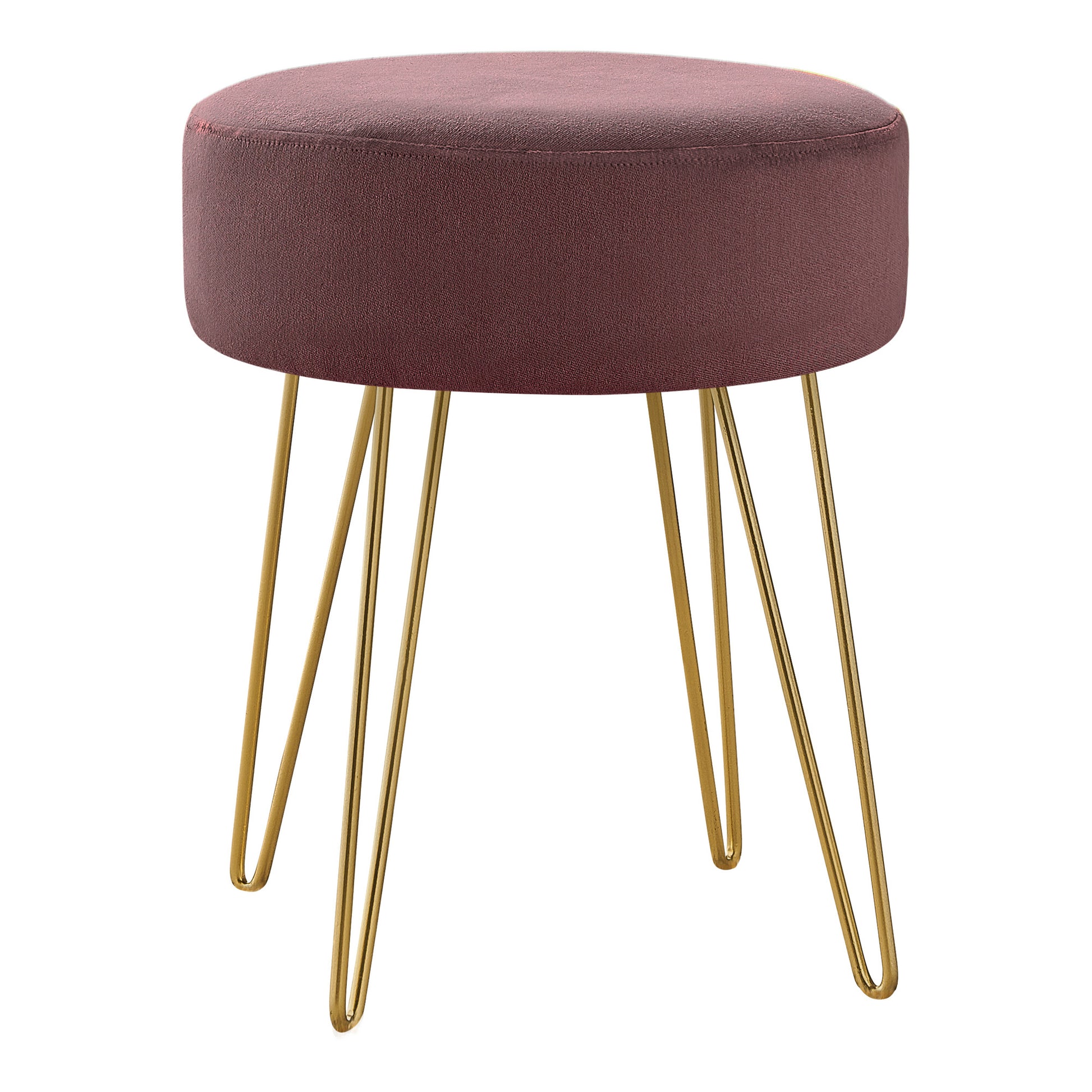 Add a good looking decorative accent to your space that is also practical for seating. A gold metal frame is finished off with a plum upholstery seat that is the epitomy of quality construction and design. Expertly upholstered with padding in a soft solid color velvet, this ottoman is as comfortable as it is good looking. Easy to blend into most any room, a ottoman is a way to add a good looking accent to your space that can also be practical and useful. . 16" H x 13.75" W x 13.75" D