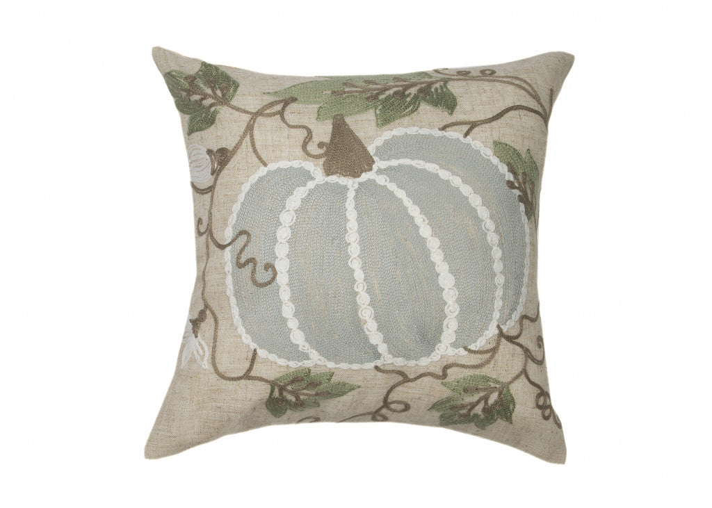 14" X 14" Beige and Gray Thanksgiving Pumpkin Linen Blend Zippered Pillow With Embroidery