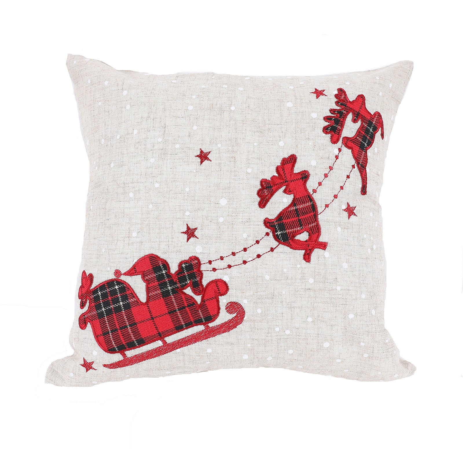 Add some Christmas cheer to your space with this 14-inch x 14-inch gray and red reindeer christmas santa and sleigh linen blend zippered pillow with applique. The gray and red coloring of the extremely durable and long lasting linen blend will add dimension and texture to your space. Fun and decorative applique add some high end and hand-crafted textural designer touches. This soft polyfill pillow not only is decorative but made to be comfy and cozy all day long. Emblazoned with the text does not apply this pillow adds some visual interest and decor to your space. Decorative throw pillows not only add color and dimension to your space but can be comfy and supportive when you are lounging and cuddling as well. Decorative pillows are a great way to change up the look and feel of your space easily and quickly. 14-inch H x 14-inch W x 4-inch D
