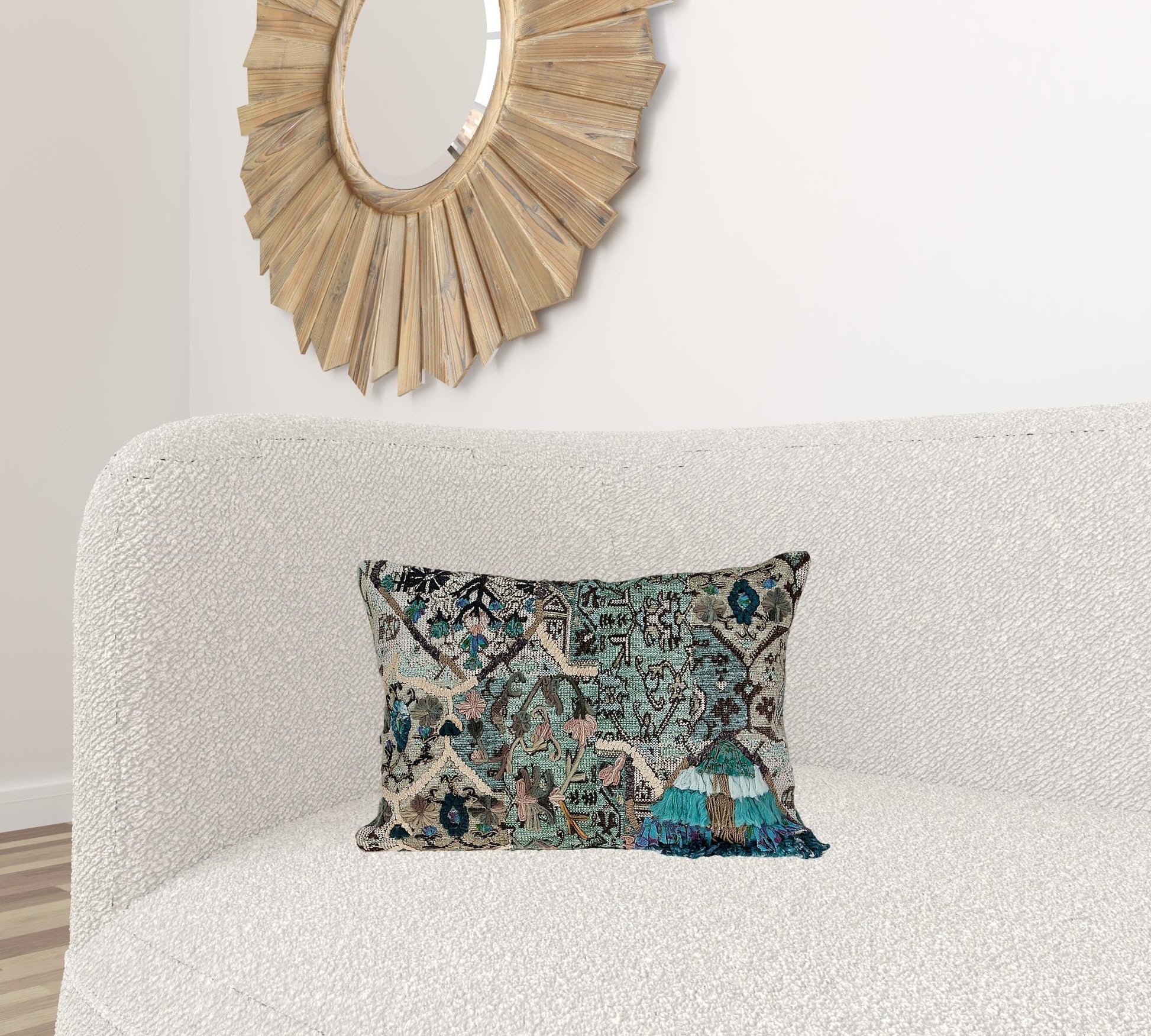 14" X 20" Beige And Green Zippered 100% Cotton Throw Pillow With Fringe
