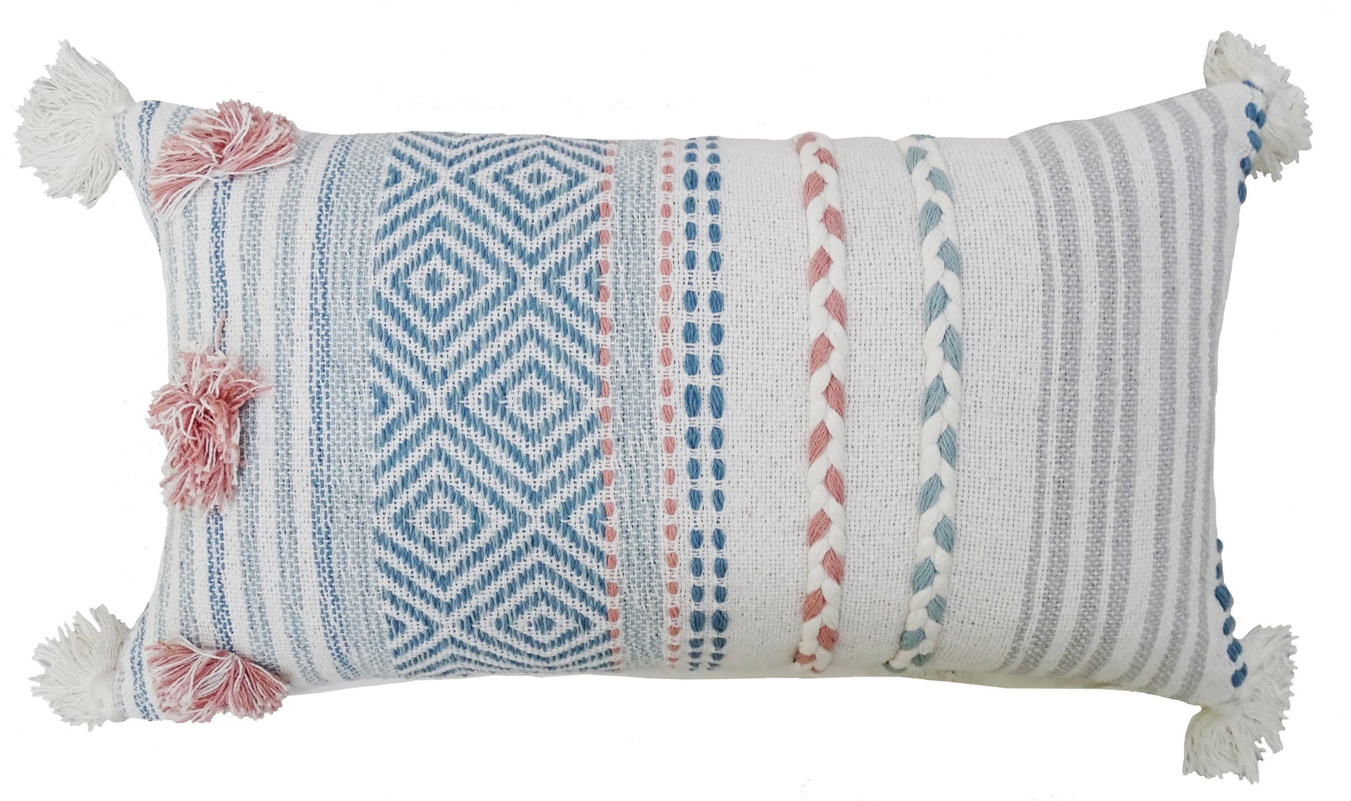 Add an air of fashion to your room and rejuvenate the space with this cute and fashionable 14" x 24" blue and pink ribbed zippered handmade cotton blend throw pillow with tassels. Fun and decorative tassels add some high end and hand-crafted textural designer touches. Great to use on its own or mix with other decorations for the perfect look. Decorative pillows are a great way to change up the look and feel of your space easily and quickly. 10" H x 14" W x 24" D