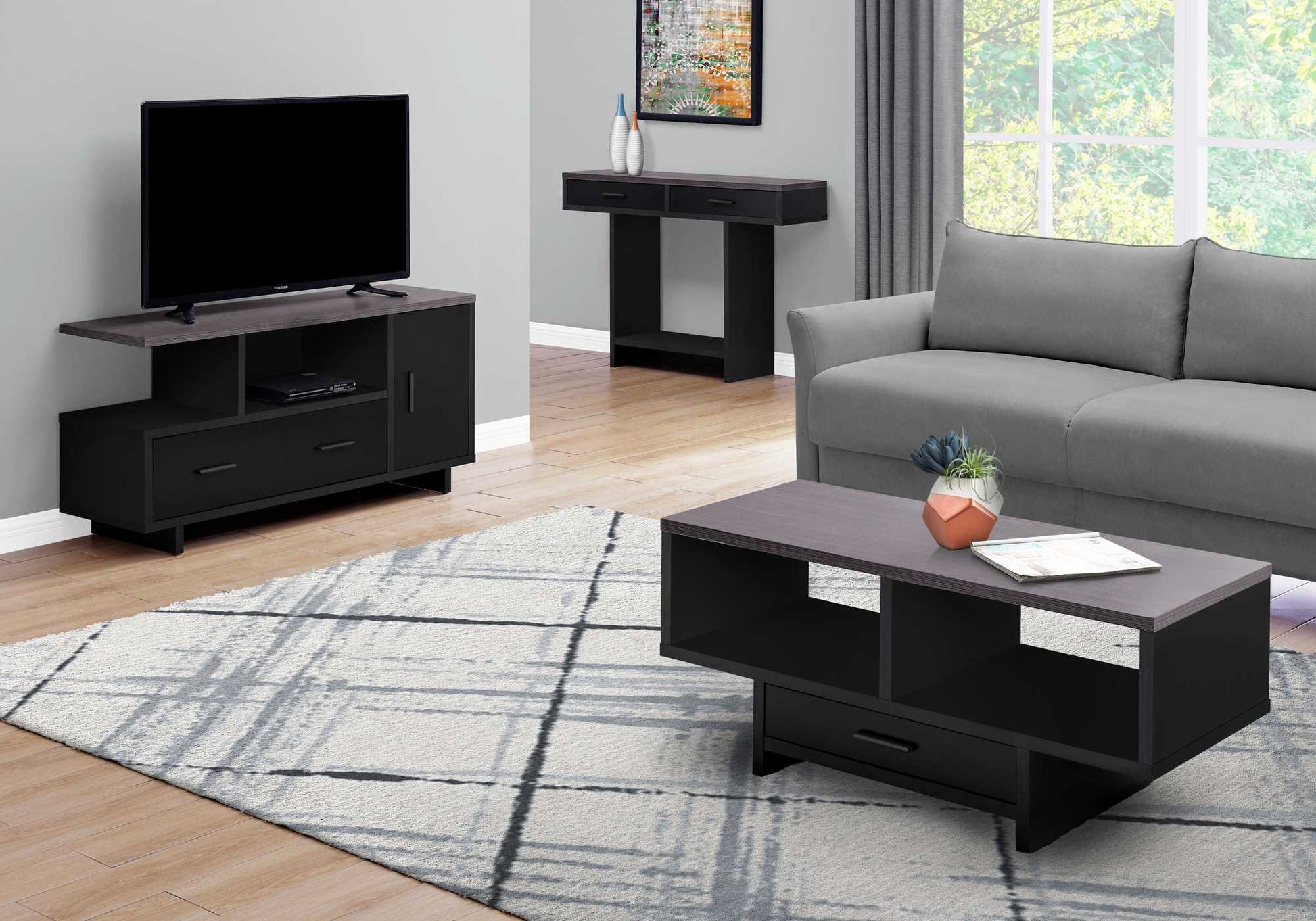 Let this contemporary style two-toned TV stand take center stage in your entertainment space! Finished in a rich black with a contrasting grey 48 inch long top, this TV stand can hold any size TV when centered. The 2 open shelf spaces can easily store you