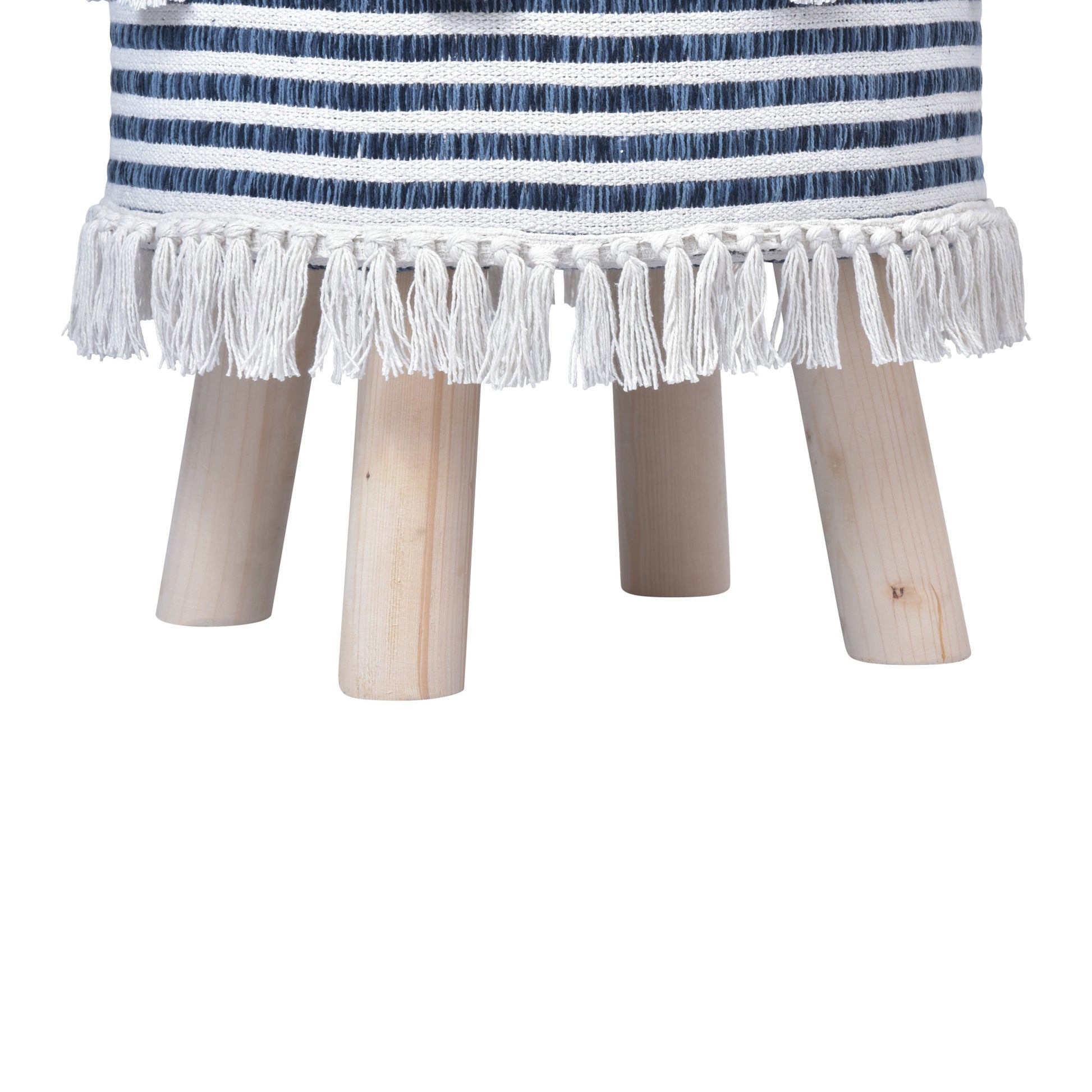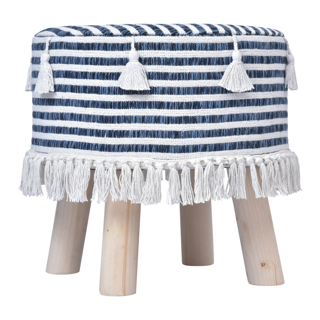 Practicality and fashion mix together with this handy 16" blue and white cotton and natural round striped ottoman. Expertly upholstered with padding and soft cotton in a striped pattern, this ottoman is as comfortable as it is good looking. Ottomans are multi-functional additions to your space that add fashion and practical value. 16" H x 16" W x 16" D