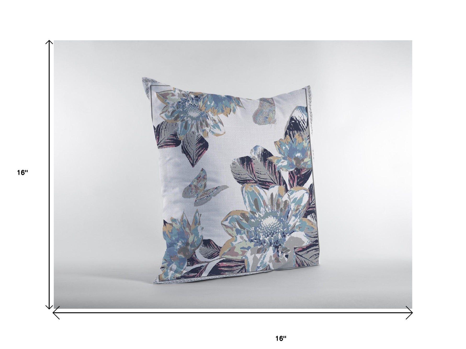 Combining floral elements with the beauty of fauna, this Gray White Butterfly Suede Throw Pillow is sure to uplift the décor of your home and make it come to life. The scintillating floral prints in a cool blue paired with the muted grays of the butterflies harmonize perfectly to induce a boho-chic aesthetic. Crafted from high-quality suede fabric for sturdy construction with a soft hand that will last for a long time and makes your space look more inviting. To ensure a fluffy look with a soft and cozy feel, this pillow is blown and closed with a durable polyfill insert for a comfortable experience. Accentuate the contemporary décor in your home with a pop of boho using the invigorating panache of this decorative throw pillow. 16” x 16” x 5”