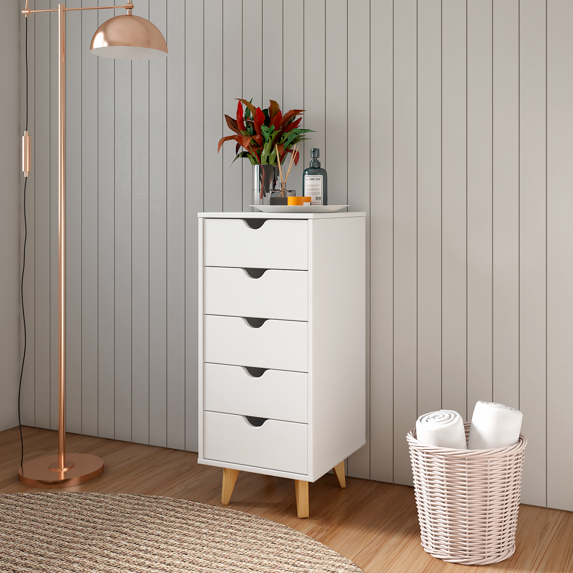 Add personality to your bedroom style and a feeling of coziness with this 16" white solid wood five drawer lingerie chest. The space saving design of this lingerie chest makes it a great choice for space challenged spaces or small walls within your room. Equipped with five easy open drawers for practical and good looking clothing storage. This dresser is built to last from high quality solid wood, The white coloration of this piece is neutral and will blend easily with most any decor. Removable drawers give this chest flexibility and multi-functionality. 36" H x 16" W x 16" D