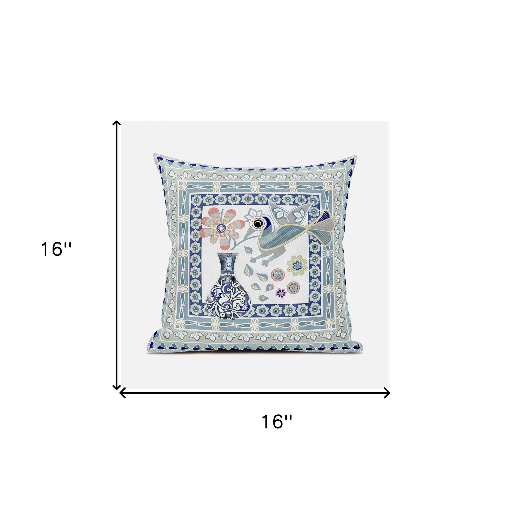 16" X 16" Blue and Beige Peacock Broadcloth Floral Zippered Pillow