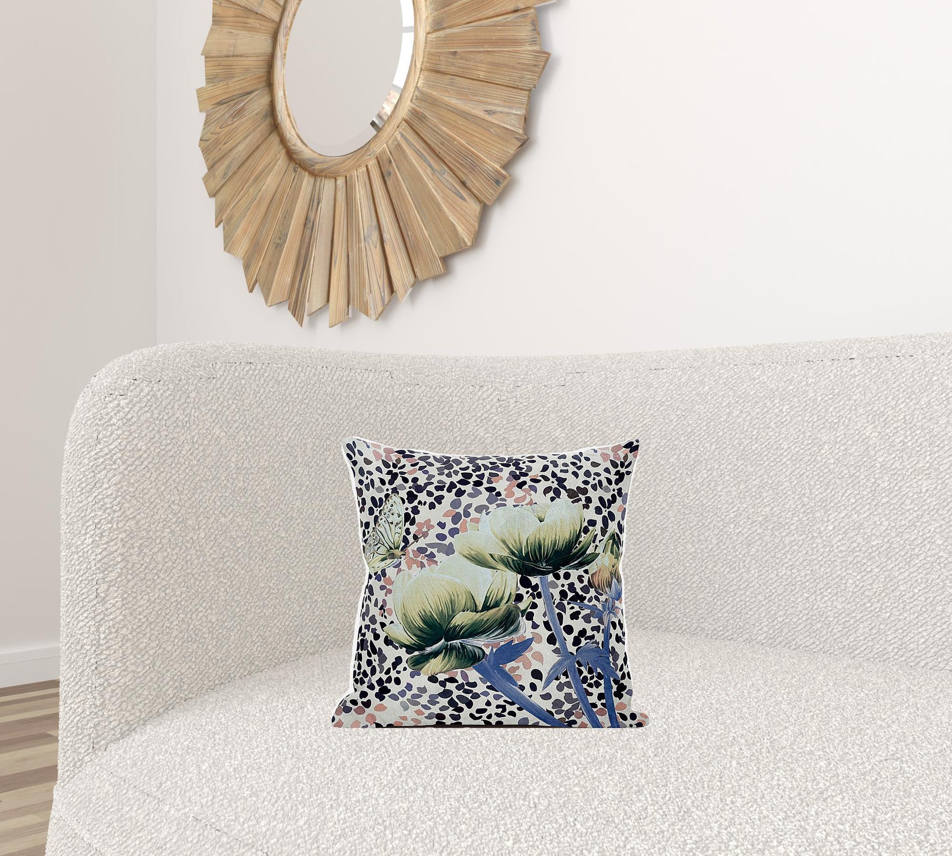 16" X 16" Blue and Black Butterfly Broadcloth Floral Zippered Pillow