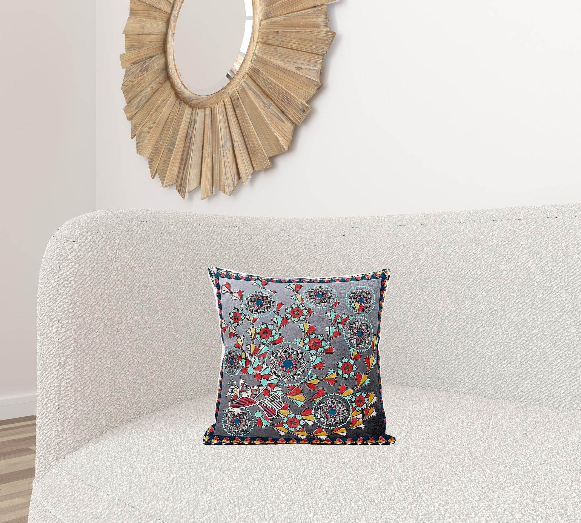 16" X 16" Blue and Gray Peacock Broadcloth Floral Zippered Pillow