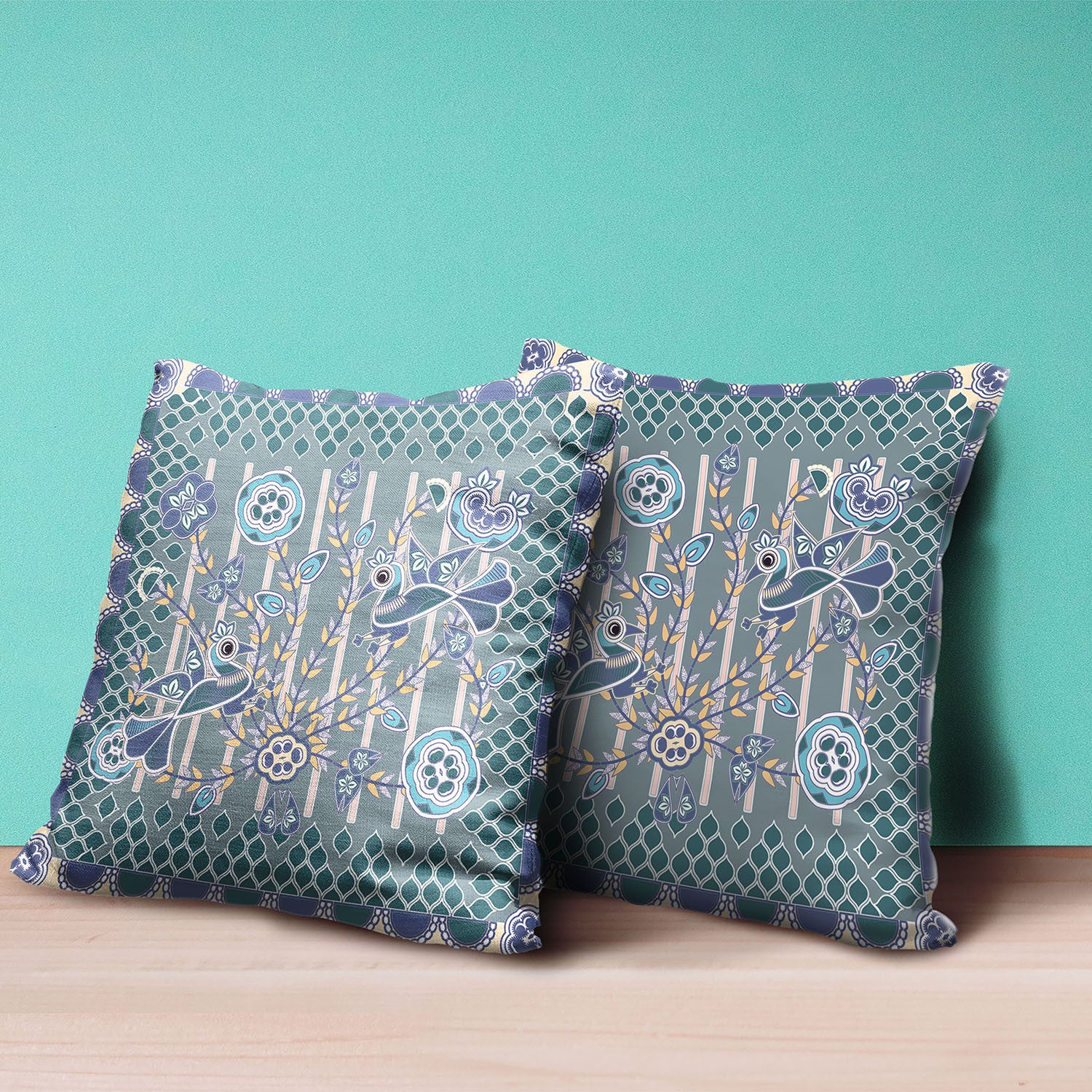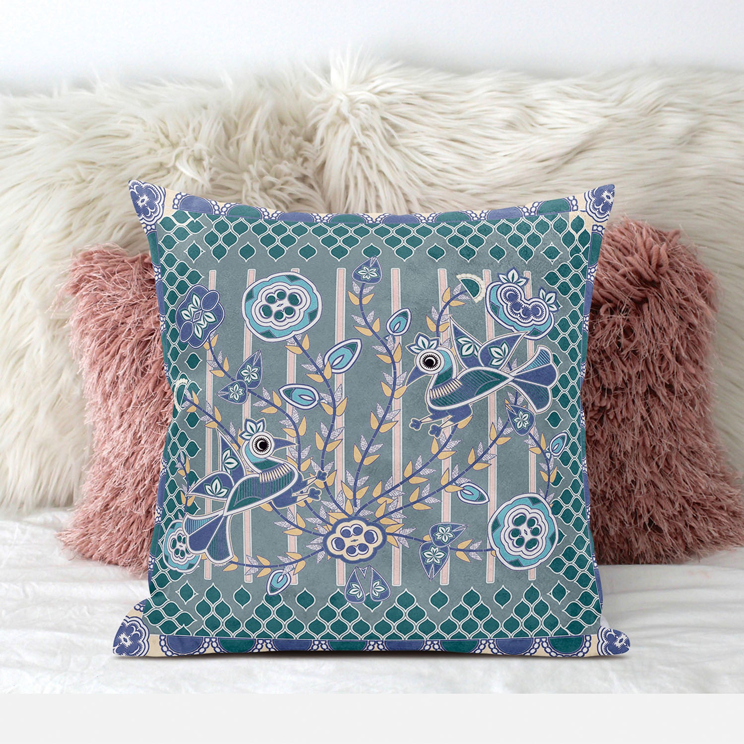 16" X 16" Blue and Gray Peacock Broadcloth Floral Zippered Pillow