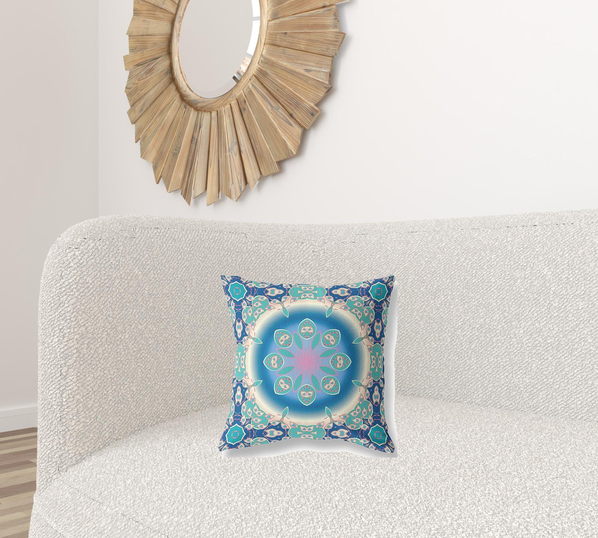 16" X 16" Blue And Turquoise Geometric Blown Seam Suede Throw Pillow
