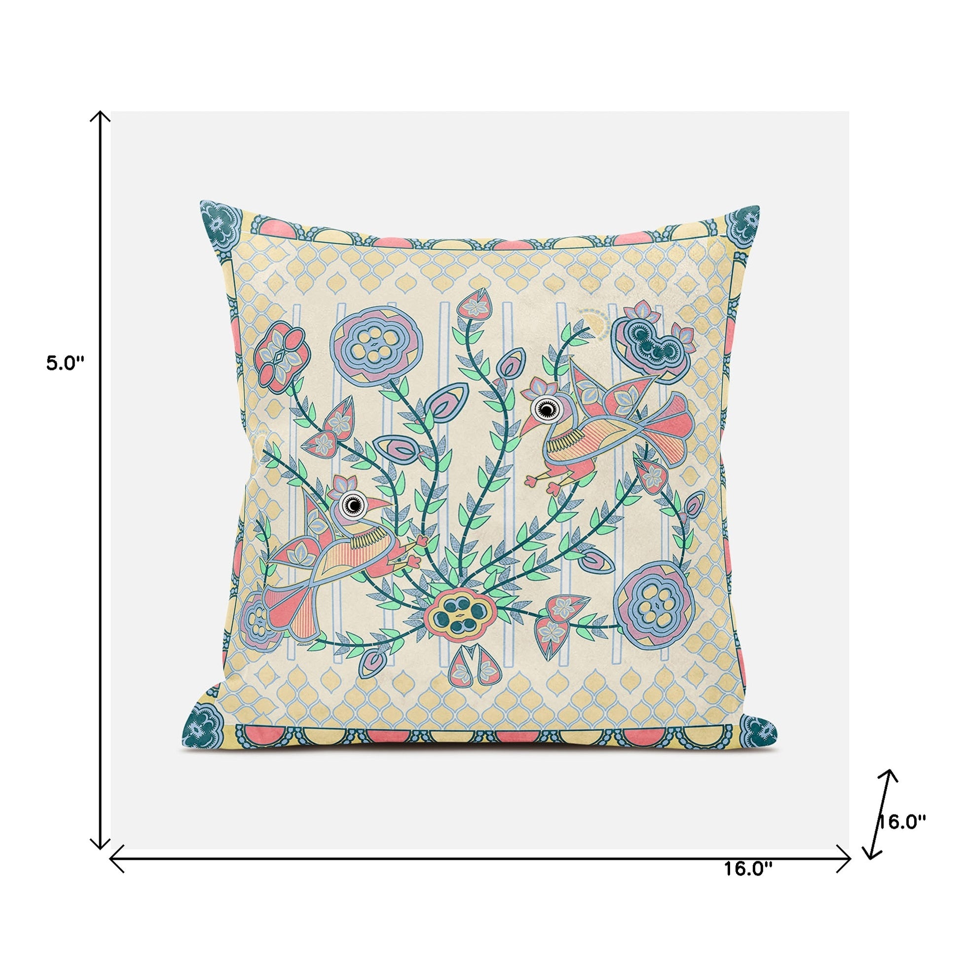 Bring a bit of fashion and zip to your space with this eye-catching and comfy 16" x 16" blue and yellow peacock broadcloth floral zippered pillow. Durable blue and yellow broadcloth has been used to give this pillow a beautiful look that will stand the test of time. Great to use on its own or mix with other decorations for the perfect look. A great decorative accessory for your favorite chair, to accent your sofa, or to use as part of your bed ensemble. 5" H x 16" W x 16" D